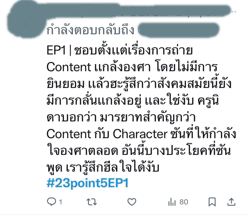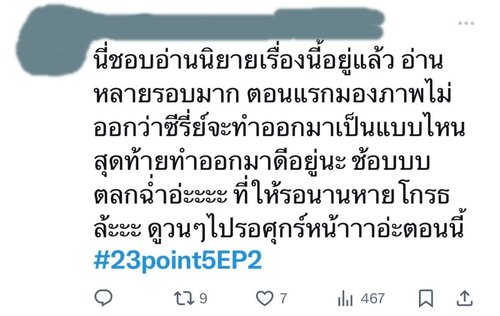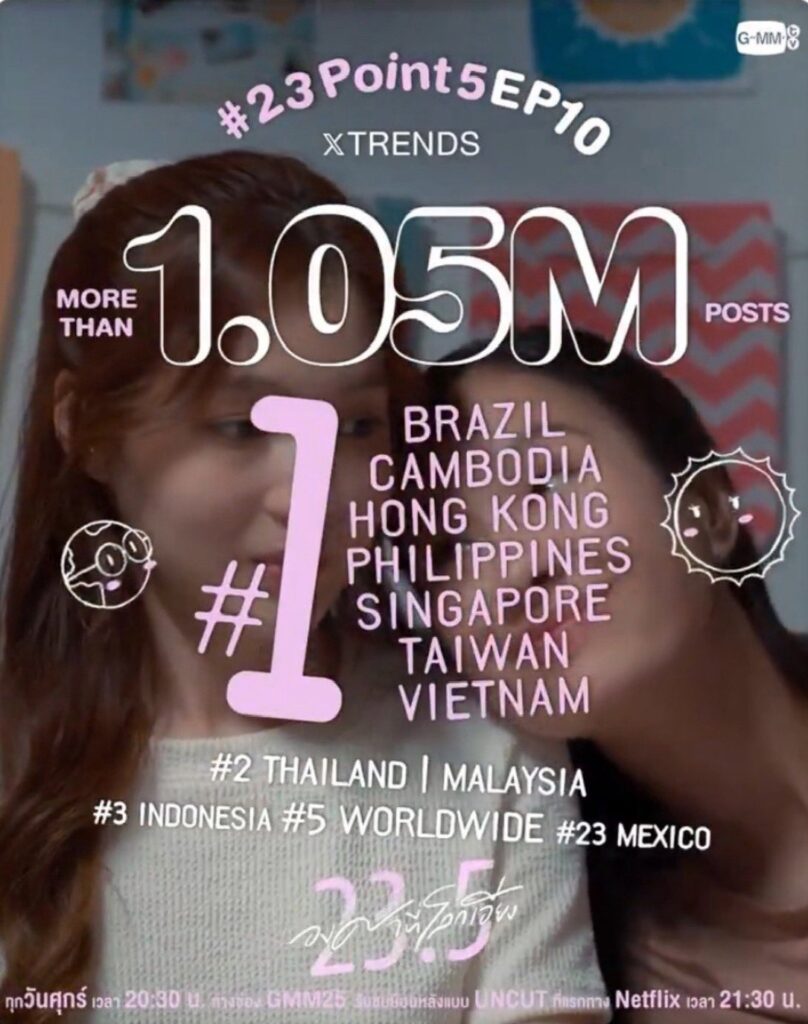ซึ่งหลังจาก #23.5point5 ออนแอร์ถึงตอนล่าสุด EP10 ยังแรงต่อเนื่อง ยอดโพสต์มากกว่า 1.05 ล้านโพสต์ และยังดัน #23point5EP10 ขึ้นเทรนด์ X “อันดับ 1” Brazil, Cambodia, Hong Kong, Philippines, Singapore, Taiwan, Vietnam และอันดับอื่น ๆ อีกมากมายในหลายพื้นที่ โดยมีเหล่าคอมเมนต์วิจารณ์พูดถึงการแสดงและฉากต่างๆ กันอย่างมากมาย