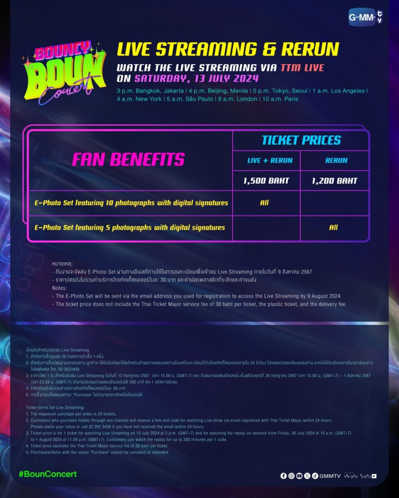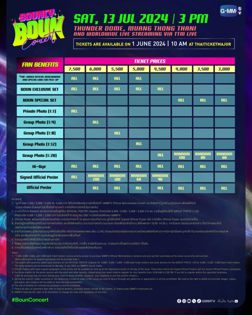 สามารถจับจองพื้นที่ความสนุกในงาน “BOUNCY BOUN CONCERT” ได้ตั้งแต่วันเสาร์ที่ 1 มิถุนายนนี้ เวลา 10.00 น. เป็นต้นไป บัตรราคา 7,500 / 6,000 / 5,500 / 5,000 / 4,500 / 4,000 / 3,500 / 3,000 บาท และดูสดผ่าน TTM LIVE บัตรราคา 1,500 / 1,200 บาท (ลิ้งค์และโค้ดรับชม) (กรณีต้องการรับบัตรพลาสติกที่ระลึก ชำระเพิ่ม 30 บาท /ใบ) ที่ ไทยทิคเก็ตเมเจอร์ทุกสาขา, www.thaiticketmajor.com, หรือ www.thaiticketmajor.com และ Call center โทร 0-2262-3456 หรือติดตามรายละเอียดเพิ่มเติมได้ที่ www.thaiticketmajor.com หรือwww.facebook.com/gmmtvofficial / Instagram / X / Tiktok / YouTube / Weibo: GMMTV
