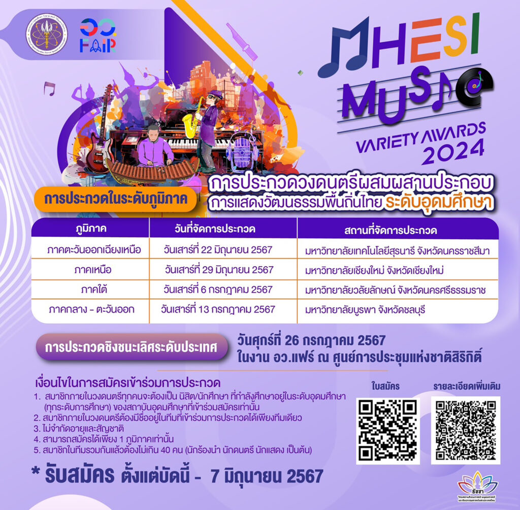 การประกวดวงดนตรีผสมผสานประกอบการแสดงวัฒนธรรมพื้นถิ่นไทย ระดับอุดมศึกษา (MHESI MUSIC VARIETY AWARD 2024) ภายใต้งานมหกรรมส่งเสริมการใช้ประโยชน์ อววน. เพื่อการพัฒนาเศรษฐกิจไทยอย่างยั่งยืนด้วยพลังสหวิทยาการ (อว.แฟร์ : Sci Power For Future Thailand)