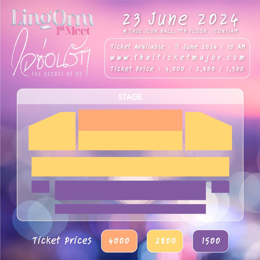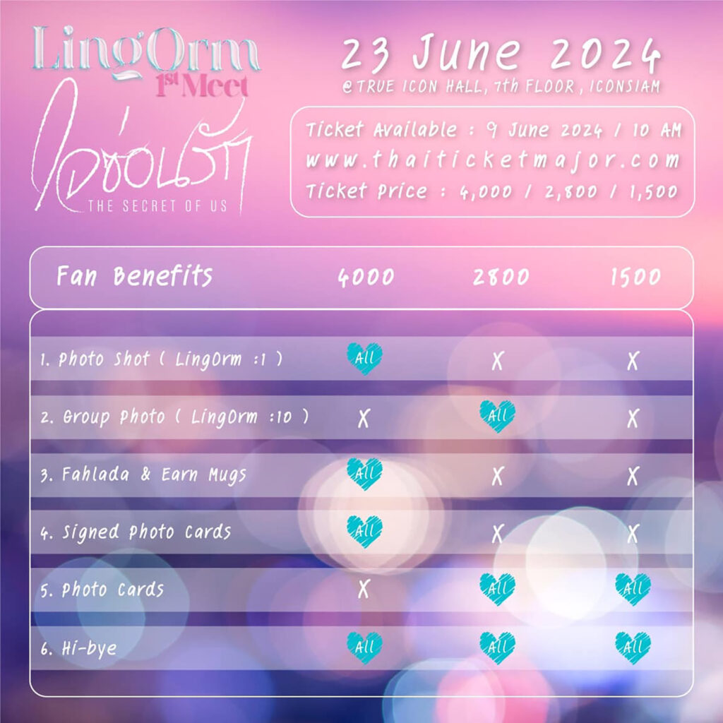 เริ่มจำหน่ายบัตรวันอาทิตย์ที่ 9 มิถุนายน 2567 เวลา 10.00 น. ทาง www.thaiticketmajor.com ราคาบัตร 4,000 / 2,800 / 1,500 บาท จัดเต็ม Fan benefits ให้แบบจุใจ แล้วพบกันในวันอาทิตย์ที่ 23 มิถุนายน 2567 เวลา 14.00 น. เป็นต้นไป ณ ทรู ไอคอน ฮอลล์ ชั้น 7 ไอคอนสยาม ติดตามรายละเอียดได้ทาง Official Fanpage Facebook และ X : ใจซ่อนรัก Secret of us Series