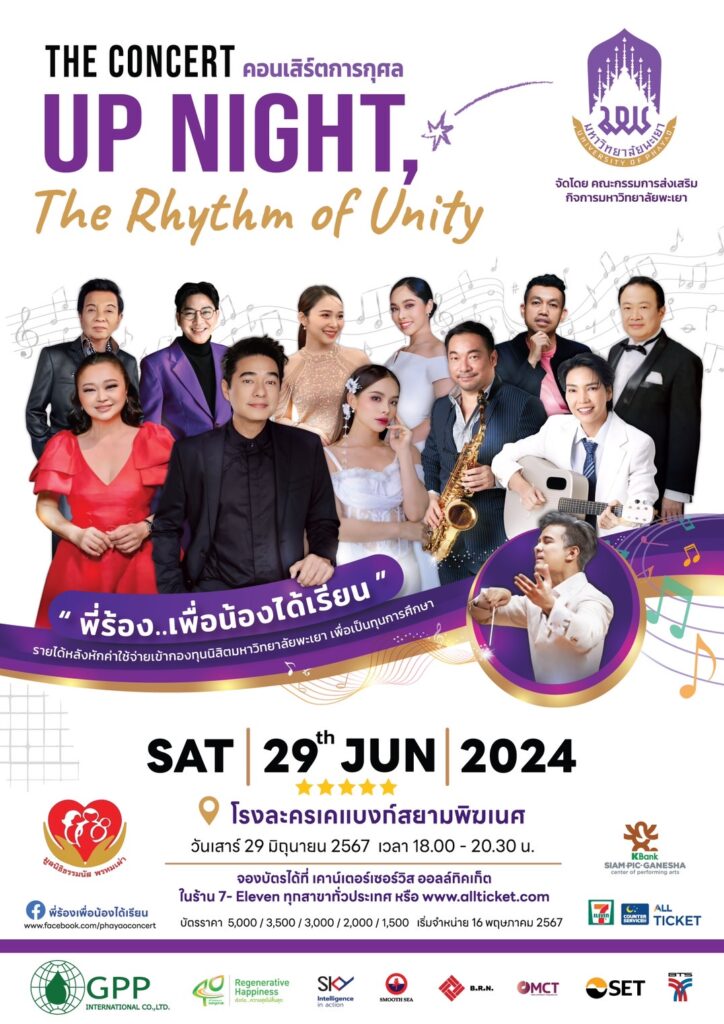 คณะกรรมการส่งเสริมกิจการมหาวิทยาลัยพะเยาขอเชิญชวนทุกท่านร่วมเป็นส่วนหนึ่งของคอนเสิร์ตการกุศล UP Night: The Rhythm of Unity “พี่ร้อง… เพื่อน้องได้เรียน” โดยการจัดงานครั้งนี้มีเป้าหมายเพื่อระดมทุนสนับสนุนการศึกษา เพื่อเป็นทุนการศึกษาให้กับนิสิต มหาวิทยาลัยพะเยา โดยรายได้หลังหักค่าใช้จ่าย จะมอบให้กับ “กองทุนนิสิตมหาวิทยาลัยพะเยา” พบกับศิลปินชื่อดังที่คุณชื่นชอบ วินัย พันธุรักษ์ / ธานินทร์ อินทรเทพ / ก้อง สหรัถ สังคปรีชา / โก้ มิสเตอร์แซ็กแมน / เจนนิเฟอร์ คิ้ม / โรส ศิรินทิพย์ / ป๊อด โมเดิร์นด็อก ธนชัย อุชชิน / หลิน วลัญจ์รัช เตชะวงศ์วัฒนา / เอิงเอย ว่าที่ ร.ต.หญิง ปภาวริญจ์ กำจรเกียรติสกุล / แนน ดาราพรรณ อ่อนจ๊อด