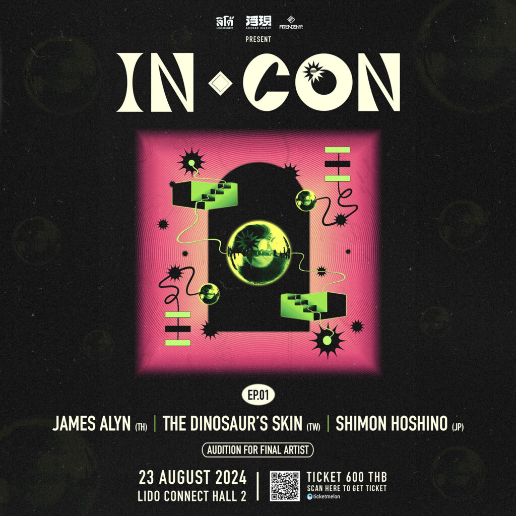 ‘IN CON’ Concert เกิดขึ้นจากความร่วมมือของ LIDO CONNECT ของ “จี๊บ – เทพอาจ กวินอนันต์” ที่มี “หญิง – พิรียา ถีระวัฒนาสวัสดิ์” นั่งแท่นบริหาร, Emerge Music และ FRIENDSHIP. ที่สร้างสรรค์และรวมศิลปินอินดี้จากทั้ง 3 ประเทศ มาบุกลิโด้ ในไลน์อัปที่หาที่ไหนไม่ได้อีกแน่นอน คือ “JAMES ALYN” จากประเทศไทย, “THE DINOSAUR’S SKIN” จากไต้หวัน และ “SHIMON HOSHINO” จากประเทศญี่ปุ่น พร้อมปลุกความเป็นอินดี้ในตัวคุณด้วยกัน ในวันที่ 23 สิงหาคม 2024 ณ LIDO CONNECT Hall 2
