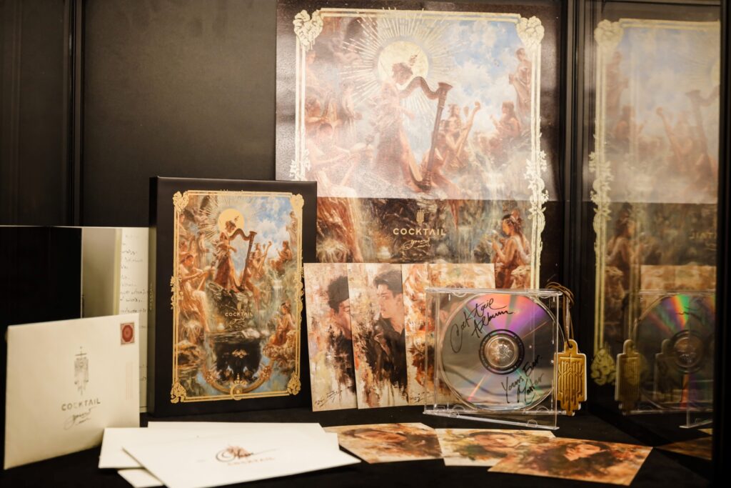 งานนี้วง COCKTAIL ได้พาเดินนำชม Exhibition ด้วยตัวเองและพูดถึงแรงบันดาลใจในงานครั้งนี้ว่า “เราคิดว่างานศิลปะสร้างแรงบันดาลใจจำนวนมากให้การทำงานตลอดมา พวกเราชอบที่มีโอกาสได้ทำงานกับศิลปินท่านอื่นๆ ในแขนงอื่นๆ เราทำในส่วนของดนตรี แต่ก็มีคนทำวิชวล คนทำซาวด์ คนทำอื่นๆ ที่เกี่ยวข้องกัน ผมว่าดนตรีสามารถเมิร์จไปกับทุกอย่างได้ นอกจากงานศิลปะและเพลงแล้วก็จะมีโซนที่เป็นของสะสมของวง มีสมุดไดอารี่, สมุดโน้ตเพลง, ตารางงาน, อัลบั้ม และอุปกรณ์ดนตรีที่เราใช้ในการทำงานตลอดที่ผ่านมา รวมถึงประวัติของวงที่ให้ทุกคนได้อ่าน และมีคอสตูมจาก COCKTAIL CLASSICS ด้วย ของเหล่านี้เป็นกิมมิคที่ทุกคนได้เห็นว่าเรามีแรงบันดาลใจจากอะไร ประสบการณ์ที่ผ่านมาคืออะไร อุปกรณ์เหล่านั้นอาจจะไม่ได้เป็นของแรร์ แต่มันมีคุณค่าทางจิตใจกับพวกเราครับ”