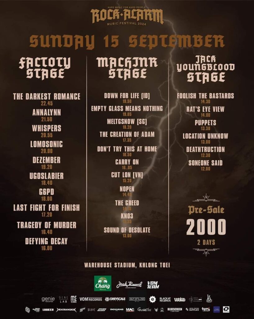 กระแสตอบรับล้นหลามอย่างต่อเนื่องสำหรับเทศกาลดนตรี Rock Alarm Music Festival 2024 ที่จะเกิดขึ้นในวันที่ 14-15 กันยายนนี้ ณ Warehouse Stadium, ท่าเรือคลองเตย ซึ่งอัดแน่นไปด้วยวงร็อกและวงเมทัลชั้นนำของบ้านเราและวงรับเชิญจากต่างประเทศมากถึง 50 วง 3 เวที นำโดย Big Ass, Retrospect, Sweet Mullet, Ebola, Lomosonic, Bomb At Track และ The Darkest Romance เป็นต้น