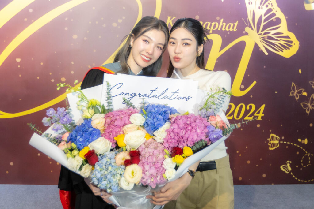 โดย ออม กรณ์นภัส เผยว่า “ดีใจและภูมิใจมาก ๆ ที่เรียนจบแล้ว แต่แอบใจหายที่เราจะไม่ได้เจอเพื่อน ๆ แล้ว เพราะเพื่อนเป็นเดอะแบกเรา ออมจบจากคณะเศรษฐศาสตร์ (หลักสูตรนานาชาติ) entrepreneurship (ผู้ประกอบการ) ที่เลือกเรียนอันนี้ เพราะมันน่าสนใจ และคิดว่าได้นำไปใช้กับที่บ้านได้ด้วย เพราะคุณพ่อทำธุรกิจส่งออกอาหารแช่แข็ง “เศรษฐชล” ตอนนี้ออมก็ได้ทุนเรียนต่อปริญญาโทด้วย ช่วงใกล้จบเป็นช่วงที่ถ่ายละคร มันก็ค่อนข้างหนักและเหนื่อยพอสมควร ก็เลยคุยกับอาจารย์ว่าออมขอทำงานเสริมส่งได้มั้ยคะ และบวกกับเพื่อน ๆ ก็ช่วยออมอีกแรงด้วย ต้องขอบคุณอาจารย์ที่ให้หนูจบ ขอบคุณเพื่อน ๆ ที่ช่วยตามงานให้หนูส่งงานจนครบ ขอบคุณผู้ใหญ่ในวงการบันเทิงทุกท่านที่ให้โอกาสออมทำงาน ขอบคุณแฟนคลับที่ซัพพอร์ตเรา เป็นเหมือนแม่จะคลอดเราเองเลย และสุดท้ายก็ขอบคุณครอบครัวเราค่ะ ที่ช่วยซัพพอร์ตทุกอย่าง ไม่ว่าเราจะตื่นไม่ไหว หมดแรง ครอบครัวก็จะเป็นแรงผลักดันให้เรามีแรงทำงานต่อ เรียนต่อ ทำให้เรามีพลังในการใช้ชีวิตต่อ ขอบคุณทุกคนมาก ๆ ด้วยนะคะ ที่ติดตามออมจนเรียนจบ”