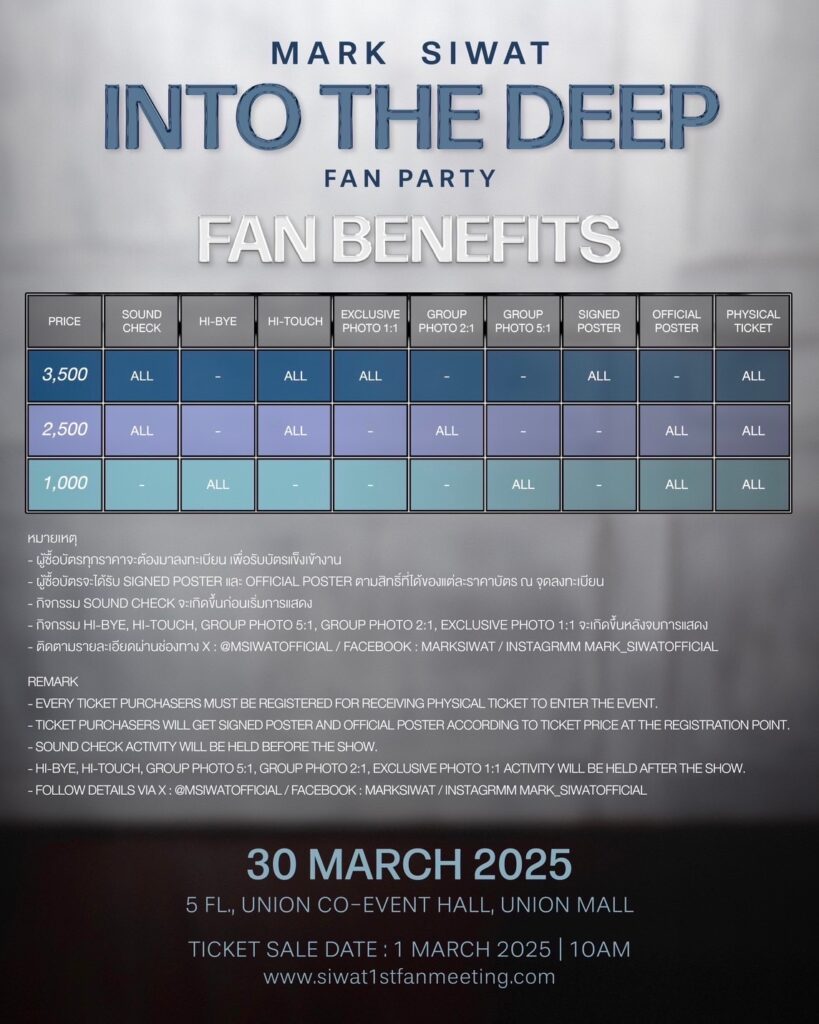 งานแฟนปาร์ตี้ “MARK SIWAT ‘INTO THE DEEP’ FAN PARTY” จะจัดขึ้นในวันที่ 30 มีนาคม พ.ศ. 2568 ณ Union Co-Event Hall, Union Mall ชั้น 5 ตั้งแต่เวลา 16:30 น. เป็นต้นไป ติดตามรายละเอียดเพิ่มเติมได้ทาง Facebook: MarkSiwat หรือ X: @MSiwatofficial