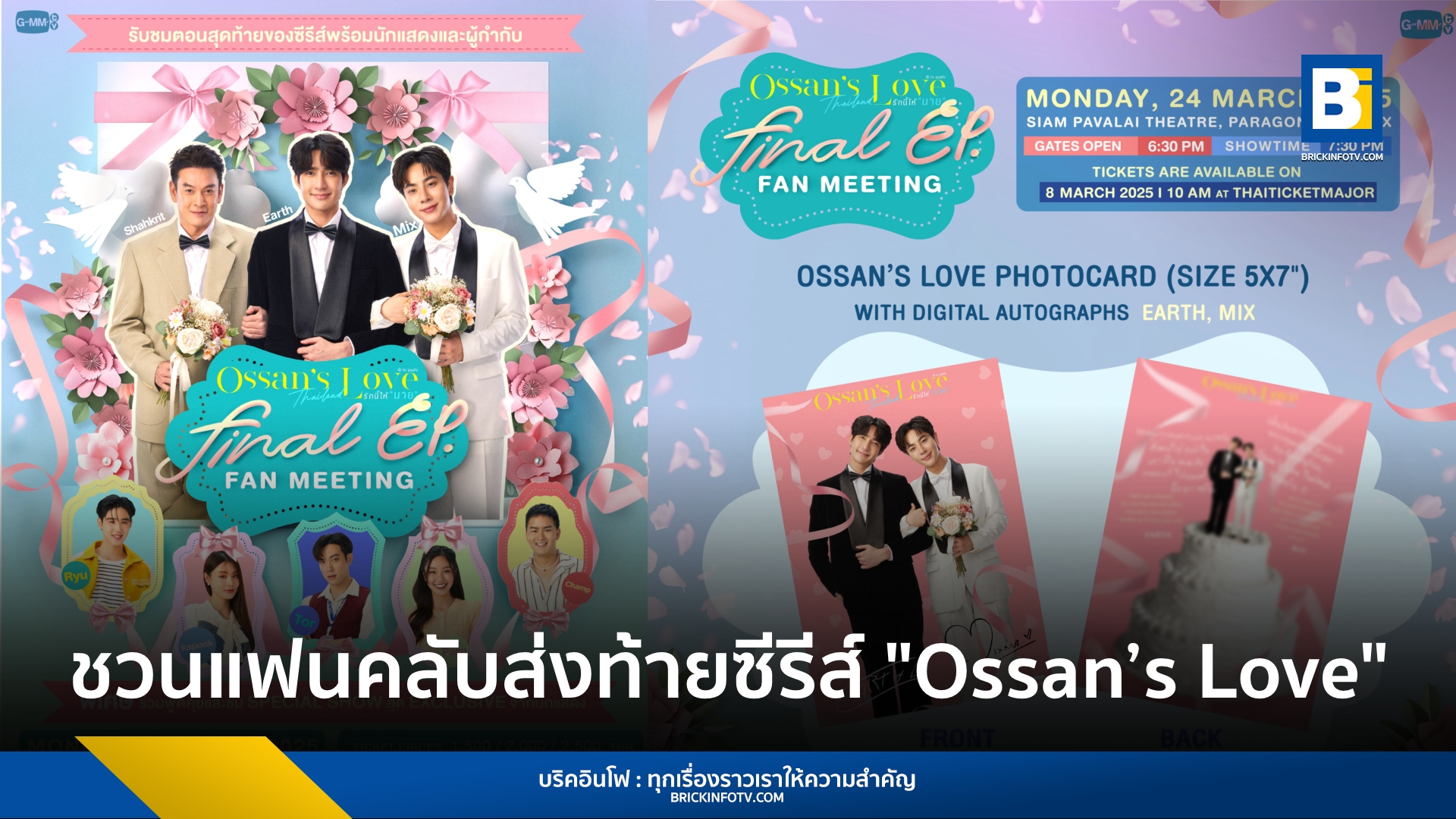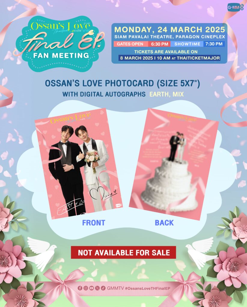 งาน “Ossan’s Love Final EP. FAN MEETING” จะจัดขึ้นในวันจันทร์ที่ 24 มีนาคม 2568 เวลา 19:30 น. ณ ชั้น 6 สยามพารากอน โรงภาพยนตร์สยามภาวลัย พารากอน ซีนีเพล็กซ์ สำหรับผู้ที่สนใจ สามารถซื้อบัตรได้ในวันเสาร์ที่ 8 มีนาคมนี้ ตั้งแต่เวลา 10:00 น. เป็นต้นไป บัตรราคา 2,500 / 2,000 / 1,500 บาท ที่ไทยทิคเก็ตเมเจอร์ทุกสาขา หรือทางเว็บไซต์ www.thaiticketmajor.com
