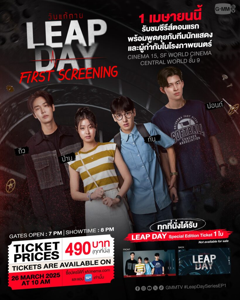 ซีรีส์ใหม่จาก GMMTV “LEAP DAY วันแก้ตาย” สร้างกระแสความสนใจอย่างมากนับตั้งแต่ปล่อยตัวอย่าง ด้วยพล็อตเรื่องลึกลับเหนือธรรมชาติที่ตัวละครต้องเผชิญชะตากรรมสุดสะพรึงในวันเกิดของตนเอง แฟน ๆ จะได้ร่วมไขปริศนาไปพร้อม ๆ กับตัวละครในงาน “LEAP DAY วันแก้ตาย: FIRST SCREENING” รอบพิเศษที่จะได้ชมตอนแรกก่อนใครในวันที่ 1 เมษายน พ.ศ. 2568 เวลา 20:00 น. ณ โรงภาพยนตร์ที่ 15 เอสเอฟ เวิลด์ ซีเนม่า เซ็นทรัลเวิลด์ ชั้น 9