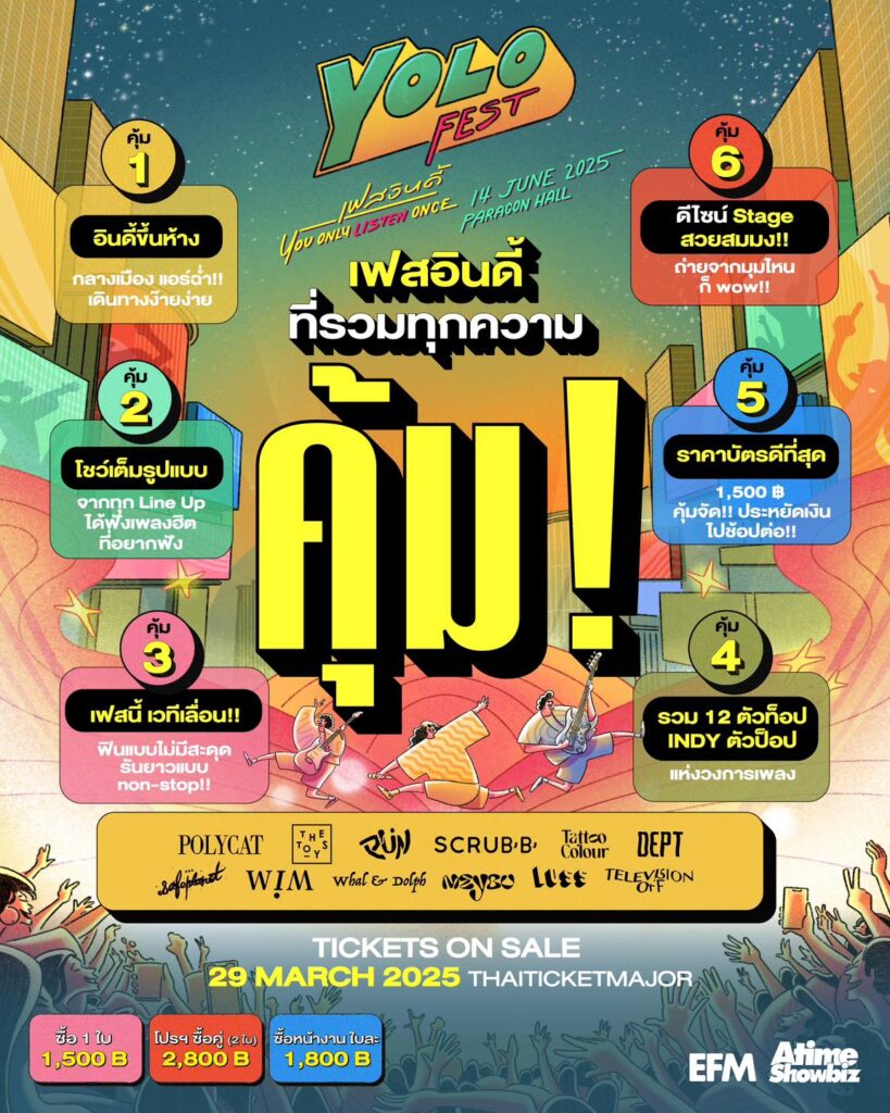 “YOLO FEST (โยโล่ เฟส)” จัดโดย ATIMESHOWBIZ และ EFM ซึ่งมีเป้าหมายที่จะสร้างประสบการณ์ทางดนตรีที่แปลกใหม่และน่าจดจำ โดยศิลปินที่จะเข้าร่วมงาน ได้แก่ TATTOO COLOUR, POLYCAT, SCRUBB, THE TOYS, SAFEPLANET, PUN, DEPT, WHAL & DOLPH, MEYOU, WIM, LUSS และ TELEVISION OFF