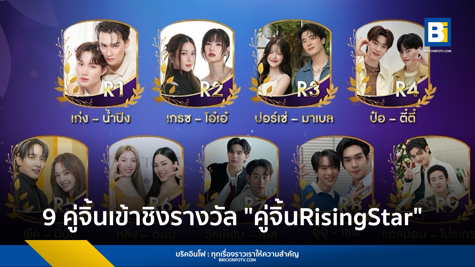ประกาศรายชื่อ 9 คู่ที่ผ่านเข้ารอบชิงรางวัล “คู่จิ้นRisingStar” ในแคมเปญ #9entertainawards2025 #sustainingthevirtue แล้ว โดยมีรายชื่อตามลำดับชื่อเล่นดังนี้ เก่ง – น้ำปิง (R1), เกรซ – โอ๋เอ๋ (R2), ปอร์เช่ – มาเบล (R3), ป๋อ – ตี๋ตี๋ (R4), พีค – มิ้นท์ (R5), หลิง – ออม (R6), วิลเลี่ยม – เอส (R7), อู่อู๋ – เซฟ (R8) และ แอลม่อน – โปรเกรส (R9)
