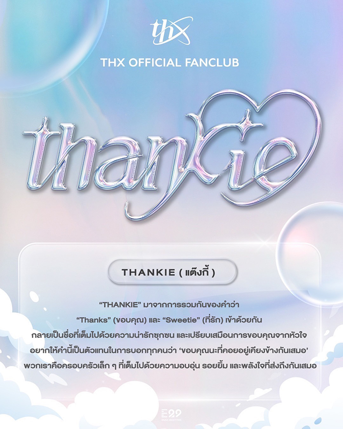 สำนักข่าวบริคอินโฟ – กลุ่มศิลปินหญิงวง THX (แธงซ์) จากค่าย E29 MUSIC IDENTITIES สร้างความอบอุ่นให้กับแฟนเพลงอย่างต่อเนื่อง หลังประสบความสำเร็จกับสองซิงเกิลล่าสุด “Horizon Love” และ “You Like Me Too?” ที่ได้รับกระแสตอบรับอย่างดี ล่าสุด วงได้ประกาศชื่อแฟนด้อมอย่างเป็นทางการว่า “THANKIE” (แต๊งกี้) ซึ่งเป็นการผสมผสานคำว่า “THANK” (ขอบคุณ) และ “SWEETIE” (ที่รัก) สื่อถึงความน่ารัก สดใส และความรู้สึกขอบคุณจากใจที่ศิลปินมีต่อแฟนคลับ