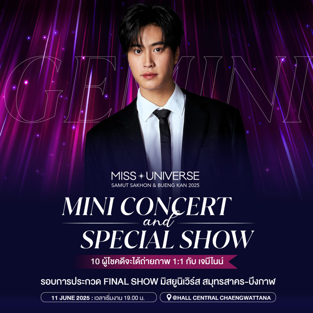 การประกวด มิสยูนิเวิร์ส สมุทรสาคร-บึงกาฬ 2025 รอบ Final Round เตรียมจัดขึ้นในวันพุธที่ 11 มิถุนายน 2568 เวลา 19.00 น. ณ แจ้งวัฒนะ ฮอลล์ ศูนย์การค้าเซ็นทรัล แจ้งวัฒนะ โดยจะมี “เจมีไนน์ นรวิชญ์ ฐิติเจริญรักษ์” ศิลปินหนุ่มเข้าร่วมแสดงมินิคอนเสิร์ตและร้องเพลงร่วมกับผู้เข้ารอบ 5 คนสุดท้าย