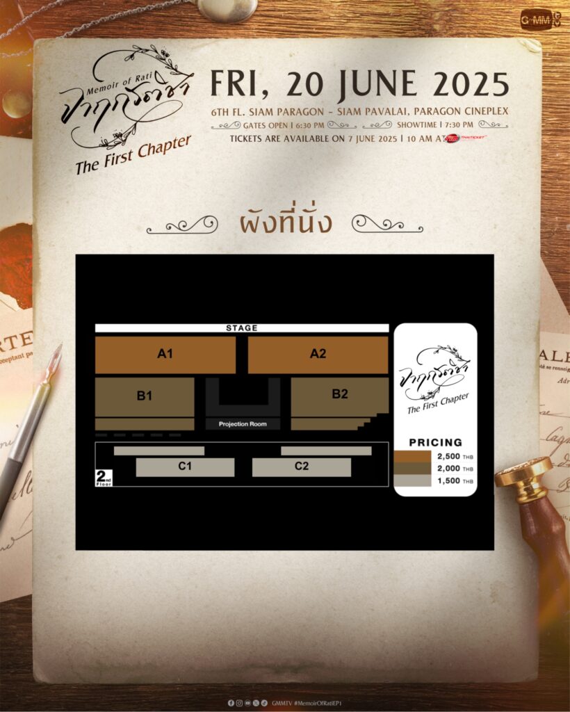 ซีรีส์วายพีเรียดเรื่องใหม่ “จาฤกรติชา Memoir Of Rati” จาก GMMTV เตรียมจัดงาน “จาฤกรติชา The First Chapter” เพื่อให้แฟนซีรีส์ได้รับชมตอนแรกพร้อมกัน ในวันศุกร์ที่ 20 มิถุนายน 2568 เวลา 19.30 น. ณ สยามภาวลัย พารากอน ซีนีเพล็กซ์ ชั้น 6 สยามพารากอน ซึ่งภายในงานจะมีการพูดคุยกับผู้กำกับและนักแสดงนำ รวมถึงการแสดงพิเศษจากทีมนักแสดงนำด้วย