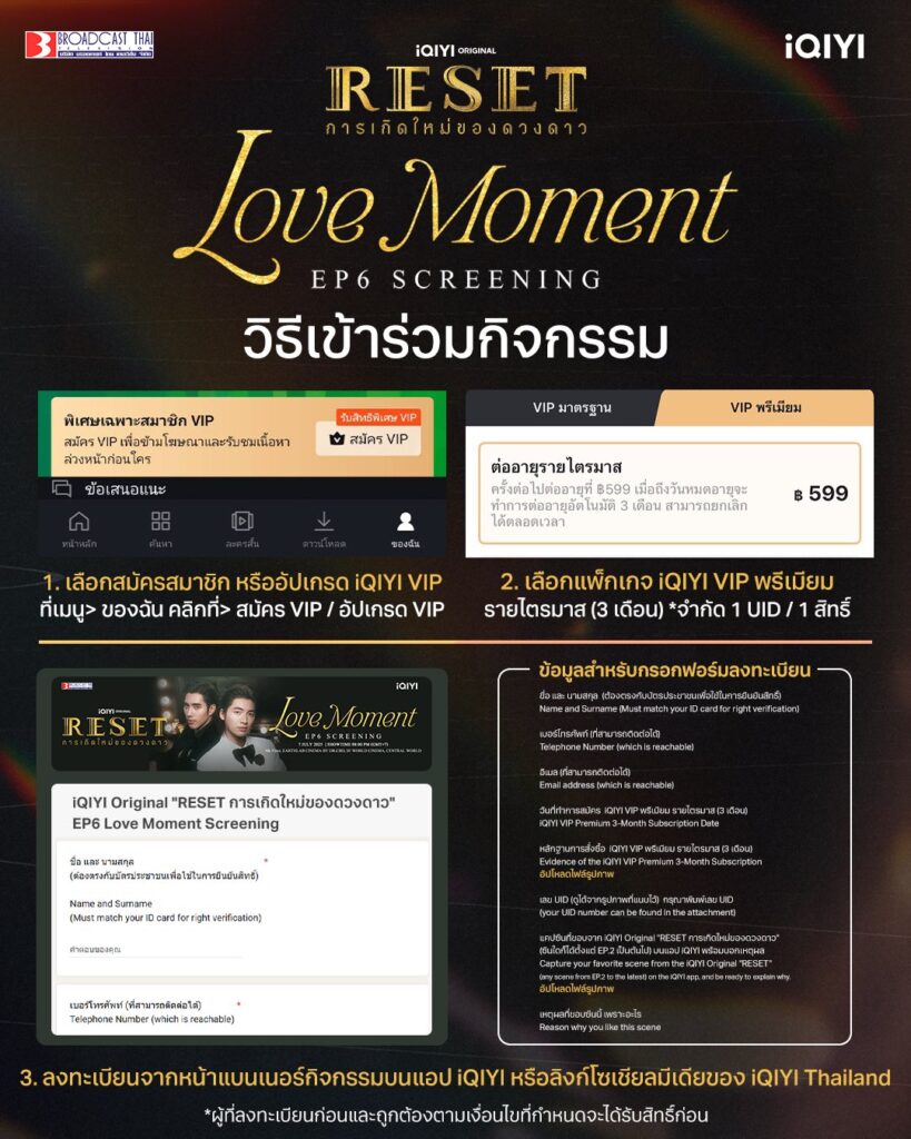 หลังจากที่ซีรีส์ iQIYI Original “RESET การเกิดใหม่ของดวงดาว” ได้รับความนิยมอย่างสูงจนทะยานขึ้นแท่นซีรีส์ที่มีผู้ชมสูงสุดจากกว่า 190 พื้นที่ทั่วโลกติดต่อกันสองสัปดาห์ ล่าสุด อ้ายฉีอี้ (iQIYI) ร่วมกับ บรอดคาซท์ ไทย เทเลวิชั่น จำกัด เตรียมจัดกิจกรรมสุดพิเศษ “iQIYI Original “RESET การเกิดใหม่ของดวงดาว” Love Moment EP6 Screening” เพื่อให้แฟนๆ ได้ใกล้ชิดกับสองนักแสดงนำ ปีเตอร์แพน ทัศน์พล วิวิธวรรธ์ และ ปอนด์ พลวิชญ์ เกตุประภากร ที่มาร่วมงานกันเป็นครั้งแรก และได้รับกระแสตอบรับที่ดีเยี่ยมจากผู้ชมทั้งในและต่างประเทศ