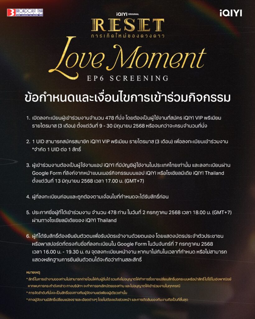 การประกาศผลผู้โชคดีที่จะได้เข้าร่วมงานจะประกาศในวันที่ 2 กรกฎาคม 2568 เวลา 18.00 น. สามารถติดตามรายละเอียดและเงื่อนไขเพิ่มเติมได้ทางโซเชียลมีเดียของ iQIYI Thailand โดยซีรีส์ iQIYI Original “RESET การเกิดใหม่ของดวงดาว” ออกอากาศทุกวันจันทร์ เวลา 22.30 น. ทางช่อง 3HD และรับชมเวอร์ชัน UNCUT เวลา 22.45 น. บนแอปพลิเคชัน อ้ายฉีอี้ (iQIYI) และเว็บไซต์ www.iQ.com เท่านั้น