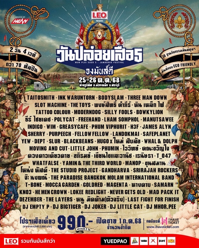 เฮฟวี่ ออแกไนซ์เซอร์ (HEAVY ORGANIZER) เตรียมจัดงาน “LEO presents วันปล่อยเสือ ปี5 ตอน จงมันส์ดี” เทศกาลดนตรีที่ผสมผสานสไตล์ค่ายลูกเสือเข้ากับแนวคิด Eco Friendly เป็นครั้งแรกในประเทศไทย งานนี้จะจัดขึ้น 2 วัน 4 เวที พร้อมศิลปินไทยกว่า 70 ชีวิต ในวันที่ 25 และ 26 ตุลาคม 2568 ณ ค่ายลูกเสือภูริทัต อำเภอมวกเหล็ก จังหวัดสระบุรี