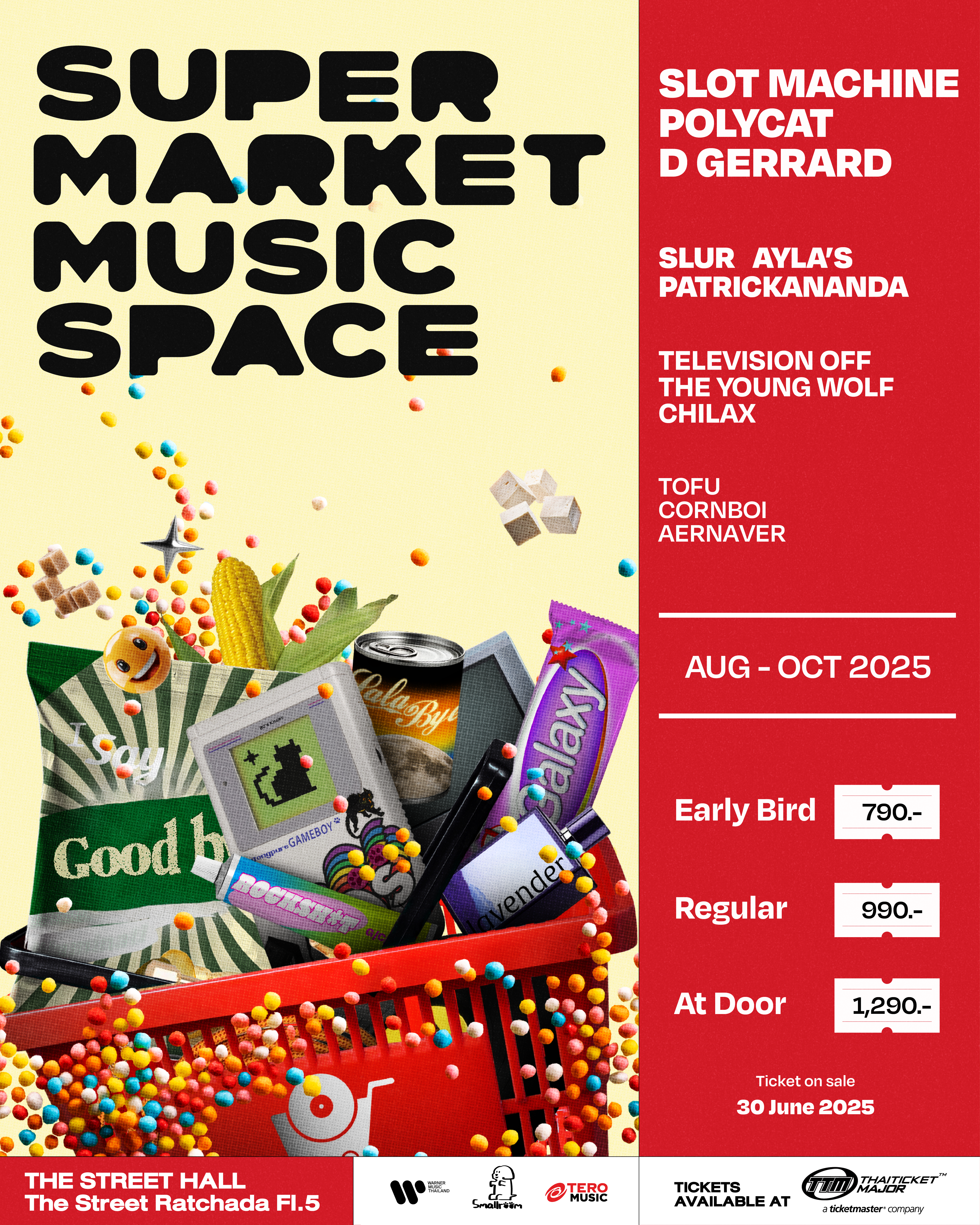 คอนเสิร์ต “Supermarket Music Space” จะแบ่งออกเป็น 3 ครั้ง โดยแต่ละครั้งจะมีไลน์อัปศิลปินที่แตกต่างกันออกไป เพื่อตอบโจทย์คอเพลงทุกสไตล์ โดย Shelf 1 จะจัดขึ้นในวันที่ 30 สิงหาคม 2568 นำทีมโดย SLOT MACHINE, AYLA’s, TELEVISION OFF และ AERNAVER ส่วน Shelf 2 กำหนดจัดวันที่ 27 กันยายน 2568 พบกับ D GERRARD, SLUR, TOFU และ THE YOUNG WOLF ปิดท้ายด้วย Shelf 3 ในวันที่ 25 ตุลาคม 2568 ที่จะได้พบกับ POLYCAT, PATRICKANANDA, CHILAX และ CORNBOI