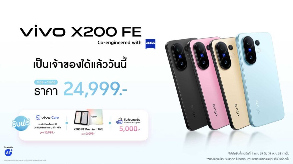 vivo X200 FE มีให้เลือก 4 สี ได้แก่ สีฟ้าบลูบรีซ (Blue Breeze), สีชมพูพิงก์ไวบ์ (Pink Vibe), สีเหลืองเยลโลว์โกลว (Yellow Glow) และ สีดำแบล็กลักซ์ (Black Luxe) โดยเปิดให้จับจองแล้ววันนี้ในราคา 24,999 บาท สำหรับรุ่นความจุ 12GB + 512GB ที่ vivo Brand Shop ทุกสาขา, ช่องทางออนไลน์ และตัวแทนจำหน่ายทั่วประเทศ สำหรับผู้ที่สั่งซื้อภายในวันที่ 4 กรกฎาคม – 31 สิงหาคม 2568 จะได้รับของสมนาคุณ อาทิ Premium Gift Box และ vivo Care ประกันตัวเครื่อง 2 ปี พร้อมประกันหน้าจอแตก 1 ครั้ง ภายใน 2 ปีแรก นอกจากนี้ยังมีโปรโมชัน “เก่าแลกใหม่” ที่สามารถรับส่วนลดเพิ่มจากการประเมินสูงสุดถึง 5,000 บาท