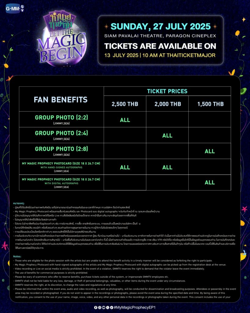 สามารถจองบัตรได้ในวันอาทิตย์ที่ 13 กรกฎาคม 2568 เวลา 10:00 น. เป็นต้นไป บัตรราคา 2,500 / 2,000 / 1,500 บาท ที่ไทยทิคเก็ตเมเจอร์ทุกสาขา เว็บไซต์ www.thaiticketmajor.com และ Call Center โทร 0-2262-3456