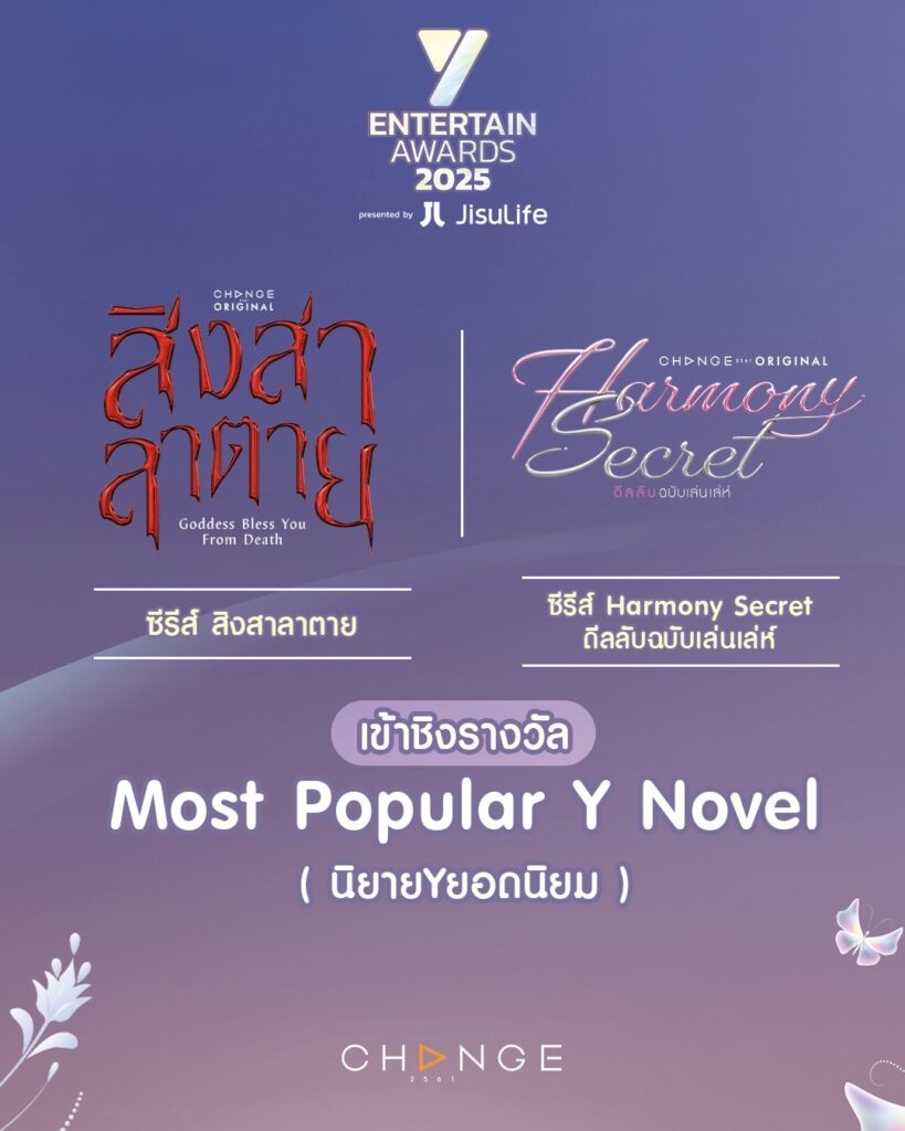 ส่วนในสาขารางวัล Most Popular Y Novel ซึ่งมอบให้กับนิยายที่ถูกนำไปสร้างเป็นซีรีส์แล้วได้รับความนิยมสูง มีผลงานของ CHANGE2561 เข้าชิงถึง 2 เรื่อง ได้แก่ นิยายเรื่อง “สิงสาลาตาย” และ “Harmony Secret” ดีลลับฉบับเล่นเล่ห์ โดยพิธีประกาศรางวัล Y Entertain Awards 2025 จะจัดขึ้นในวันอังคารที่ 23 กันยายน 2568 ณ ทรู ไอคอน ฮอลล์ ชั้น 7 ไอคอนสยาม