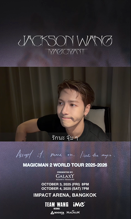 ศิลปินระดับโลกอย่าง แจ็คสัน หวัง (Jackson Wang) เตรียมเปิดเวิลด์ทัวร์ครั้งใหม่ “MAGICMAN 2 WORLD TOUR 2025-2026 in Bangkok Presented by Galaxy Resorts Thailand” โดยเลือกประเทศไทยเป็นจุดเริ่มต้นแรกของการทัวร์ครั้งนี้ ซึ่งจะจัดขึ้น 2 รอบการแสดง ในวันศุกร์ที่ 3 ตุลาคม 2568 เวลา 20:00 น. และวันเสาร์ที่ 4 ตุลาคม 2568 เวลา 19:00 น. ณ อิมแพ็ค อารีน่า เมืองทองธานี โดยมีผู้จัดคือ iMe Thailand