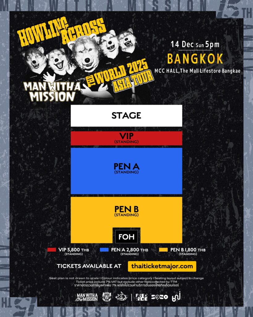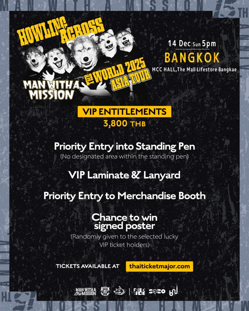 วงร็อกชื่อดังจากประเทศญี่ปุ่นอย่าง MAN WITH A MISSION หรือ MWAM เตรียมกลับมาเปิดการแสดงสดในประเทศไทยอีกครั้งในคอนเสิร์ต “HOWLING ACROSS THE WORLD 2025 – ASIA TOUR” โดยกำหนดจัดขึ้นที่กรุงเทพฯ ในวันอาทิตย์ที่ 14 ธันวาคม 2568 ณ MCC HALL, The Mall Lifestore บางแค ซึ่งจะเป็นการแสดงโชว์สุดท้ายของการทัวร์ในทวีปเอเชียครั้งนี้