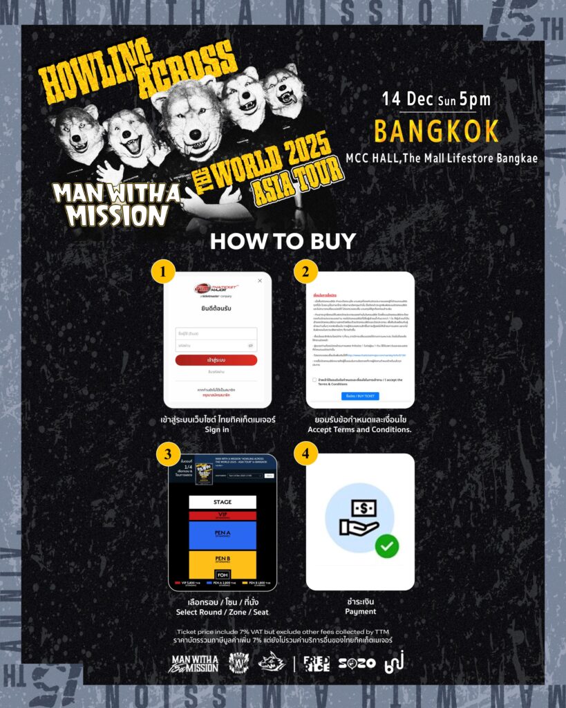 การแสดงครั้งนี้จัดขึ้นโดยความร่วมมือของ FriedRice Entertainment, SOZO และ BNJ Entertainment โดยจะเปิดจำหน่ายบัตรคอนเสิร์ต MAN WITH A MISSION “HOWLING ACROSS THE WORLD 2025 – ASIA TOUR” ในวันที่ 31 สิงหาคม 2568 ตั้งแต่เวลา 14:00 น. เป็นต้นไป ผ่านทางเว็บไซต์ thaiticketmajor.com