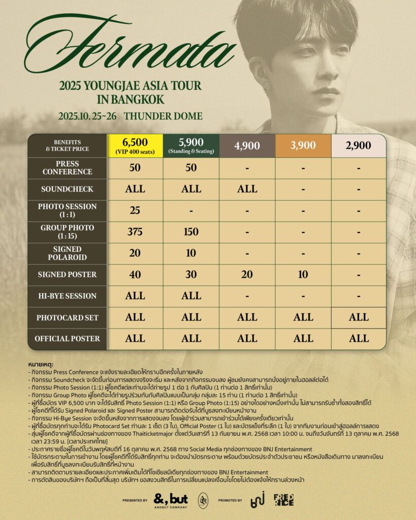 สำหรับคอนเสิร์ต “2025 YOUNGJAE ASIA TOUR [Fermata] IN BANGKOK” จะจัดขึ้นในวันที่ 25 ตุลาคม 2568 และ 26 ตุลาคม 2568 ณ ธันเดอร์โดม เมืองทองธานี โดยการจัดงานครั้งนี้เป็นความร่วมมือระหว่างต้นสังกัด AndBut Company และผู้จัดในประเทศไทยอย่าง BNJ Entertainment และ FriedRice Entertainment ส่วนราคาบัตรราคา 6,500 บาท / 5,900 บาท/ 4,900 บาท / 3,900 บาท / 2,900 บาท พร้อมสิทธิพิเศษที่แฟน ๆ จะได้รับอีกมากมาย