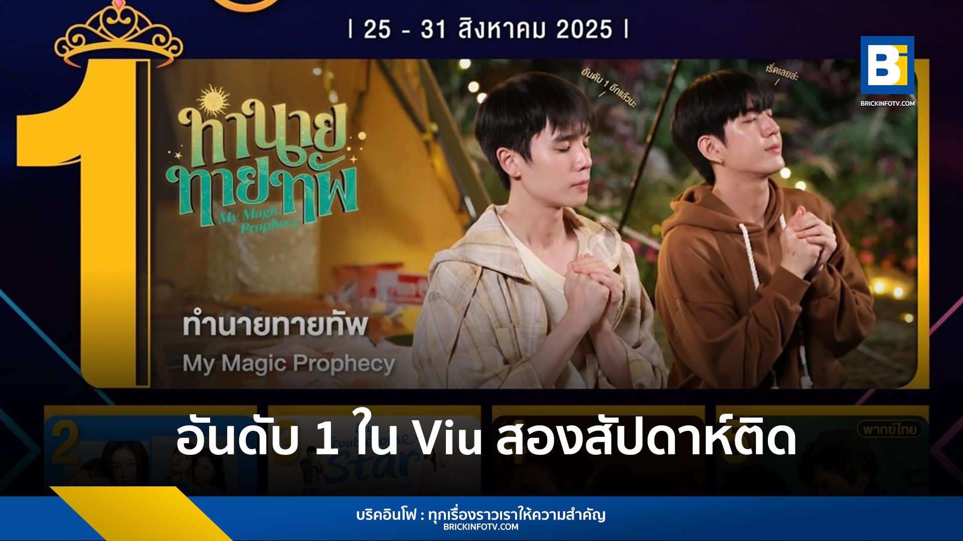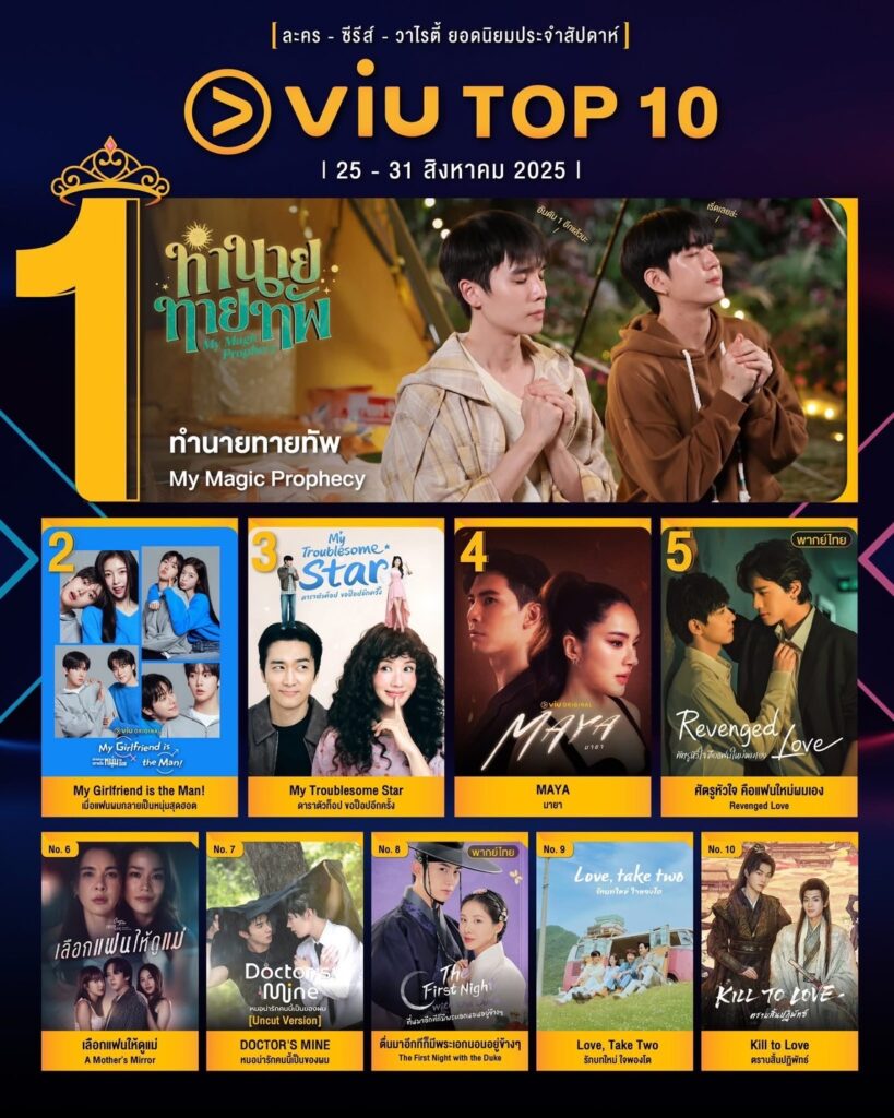“ทำนายทายทัพ My Magic Prophecy” ที่นำแสดงโดย จิมมี่ จิตรพล โพธิวิหค และ ซี ทวินันท์ อนุกูลประเสริฐ สามารถครองอันดับ 1 ซีรีส์ยอดนิยมบนแพลตฟอร์ม ได้ถึง 2 สัปดาห์ติดต่อกัน โดยตัวซีรีส์เล่าเรื่องราวความสัมพันธ์ของชายหนุ่ม 2 คนที่มีแนวคิดต่างกันอย่างสุดขั้ว
