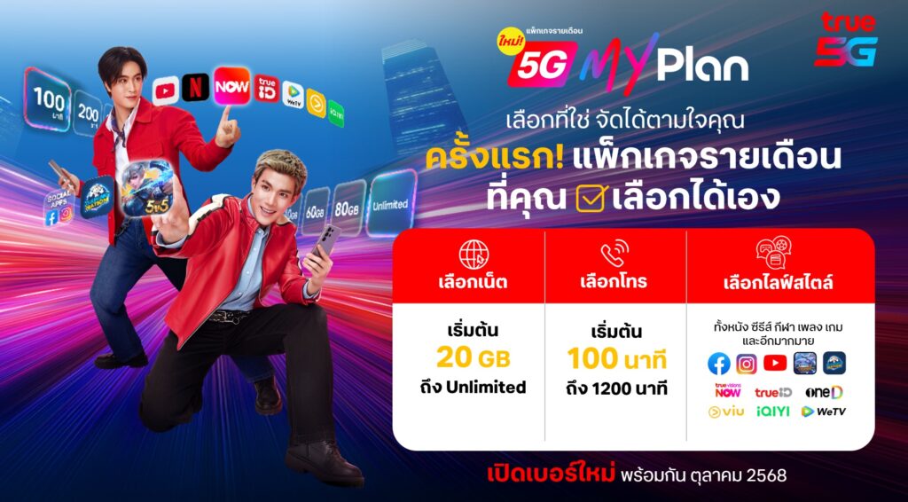 นายโรจน์ เดโชดมพันธ์ หัวหน้าสายงานโมบายล์ โพสต์เพย์ บริษัท ทรู คอร์ปอเรชั่น จำกัด (มหาชน) ให้ข้อมูลเพิ่มเติมว่า “จากการศึกษาเชิงลึกพบว่ากลุ่มคนอายุ 18-24 ปี มีพฤติกรรมการใช้งานอินเทอร์เน็ตบนมือถือเฉลี่ย 42 GB ต่อเดือน ซึ่งสูงกว่ากลุ่มอื่นถึง 68% โดยคนกลุ่มนี้ต้องการความยืดหยุ่นในการปรับเปลี่ยนแพ็กเกจตามความต้องการ และคำนึงถึงความคุ้มค่าและคุณภาพของเครือข่ายเป็นสำคัญ จึงเป็นที่มาของแพ็กเกจ “5G MyPlan” ซึ่งเป็นครั้งแรกที่ลูกค้าสามารถออกแบบแพ็กเกจรายเดือนของตัวเองได้อย่างอิสระ ทั้งอินเทอร์เน็ต, การโทร และบริการเสริมต่างๆ บนเครือข่าย 5G นอกจากนี้ ยังมีส่วนลด 10% สำหรับนักเรียน นักศึกษา และผู้ใหญ่อายุ 55 ปีขึ้นไป โดยแพ็กเกจนี้จะเริ่มให้บริการตั้งแต่เดือนตุลาคม 2568 เป็นต้นไป”