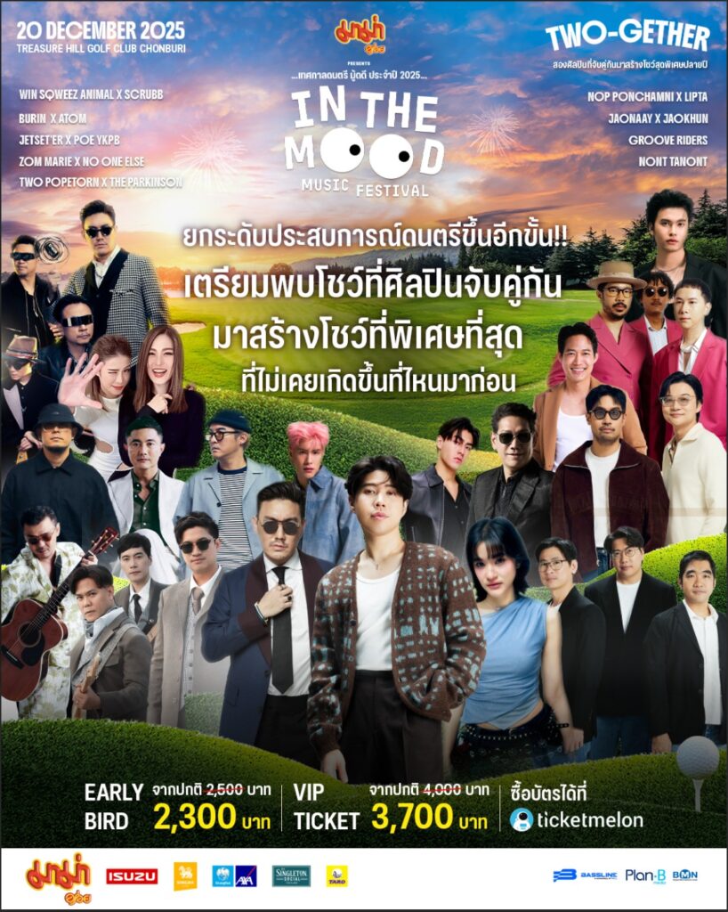 เทศกาลดนตรีส่งท้ายปี “มาม่า Presents In The Mood Music Festival 2025” กลับมาอีกครั้งภายใต้คอนเซ็ปต์ “TWO-GETHER” โดยปีนี้ BASSLINE ผู้จัดงาน ได้ยกระดับประสบการณ์ดนตรีด้วยการจับคู่ศิลปินชื่อดังถึง 7 คู่ และ 3 ศิลปินรับเชิญพิเศษ เพื่อร่วมสร้างสรรค์โชว์ที่ไม่เคยมีที่ไหนมาก่อนบนเวทีเดียวกัน จัดขึ้นในบรรยากาศสุดชิล ท่ามกลางวิวสนามกอล์ฟและขุนเขา ณ Treasure Hill Golf Club จังหวัดชลบุรี ในวันเสาร์ที่ 20 ธันวาคม 2568 เพื่อเป็นอีกหนึ่งจุดหมายสำหรับผู้ที่ต้องการหลีกหนีความวุ่นวายในเมืองในช่วงสุดสัปดาห์ก่อนปีใหม่