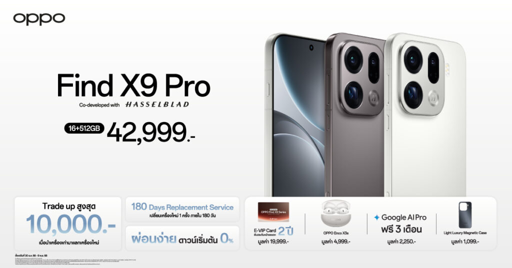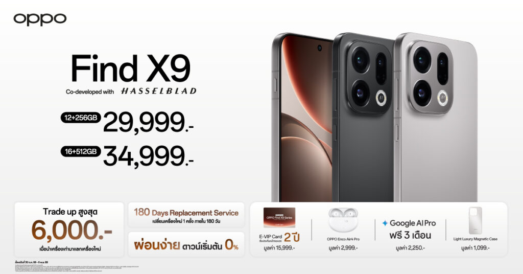 OPPO Find X9 Series มาพร้อมกับระบบปฏิบัติการ ColorOS 16 ใหม่ล่าสุด และชิปเซ็ต MediaTek Dimensity 9500 พร้อมฟีเจอร์ AI Mind Space ผู้ช่วยอัจฉริยะ นอกจากนี้ยังมีการเปิดตัวหูฟังไร้สาย OPPO Enco X3s ที่มาพร้อมระบบตัดเสียงรบกวน 55dB และการปรับจูนโดย Dynaudio ในราคา 4,999 บาท และชุดเลนส์เสริม Hasselblad Teleconverter ในราคา 6,999 บาท (ใช้ได้กับ OPPO Find X9 Pro เท่านั้น)