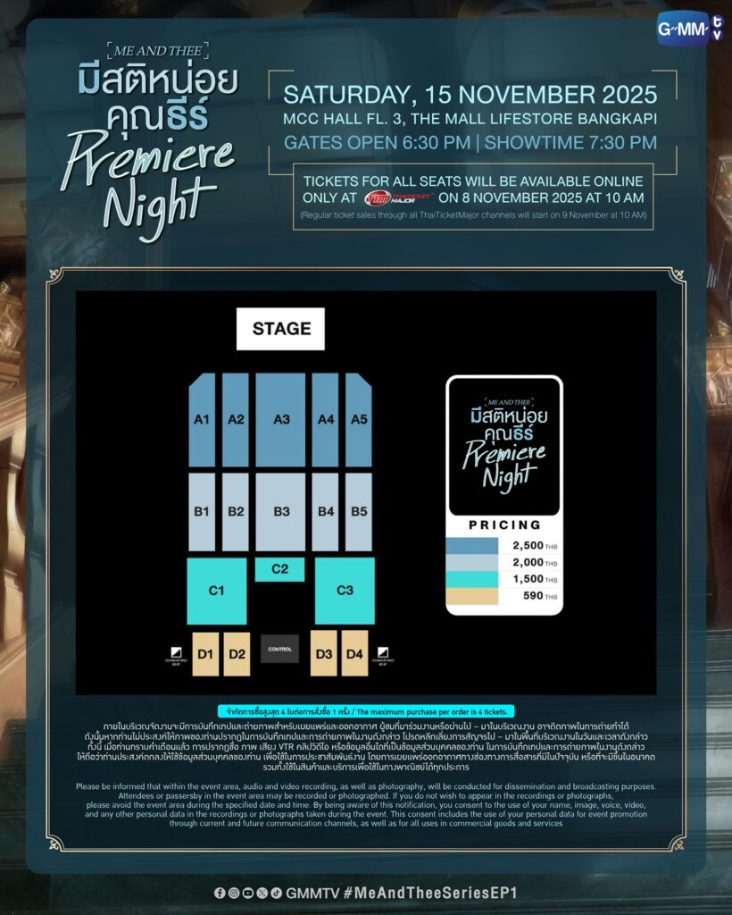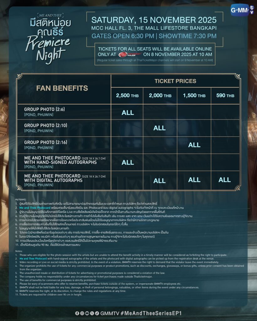 มีสติหน่อยคุณธีร์ Me and Thee Premiere Night ซื้อบัตรได้ในวันเสาร์ที่ 8 พฤศจิกายนนี้ เริ่มเวลา 10:00 น. เป็นต้นไป ผ่านช่องทางออนไลน์ที่เว็บไซต์ www.thaiticketmajor.com เท่านั้น และจะเปิดจำหน่ายบัตรทุกช่องทางตามปกติ ในวันอาทิตย์ที่ 9 พฤศจิกายน 2568 ตั้งแต่เวลา 10:00 น. บัตรราคา ได้แก่ 2,500 บาท, 2,000 บาท, 1,500 บาท และ 590 บาท ไทยทิคเก็ตเมเจอร์ ทุกสาขา รวมถึงเว็บไซต์ www.thaiticketmajor.com และ Call Center โทร 0-2262-3456