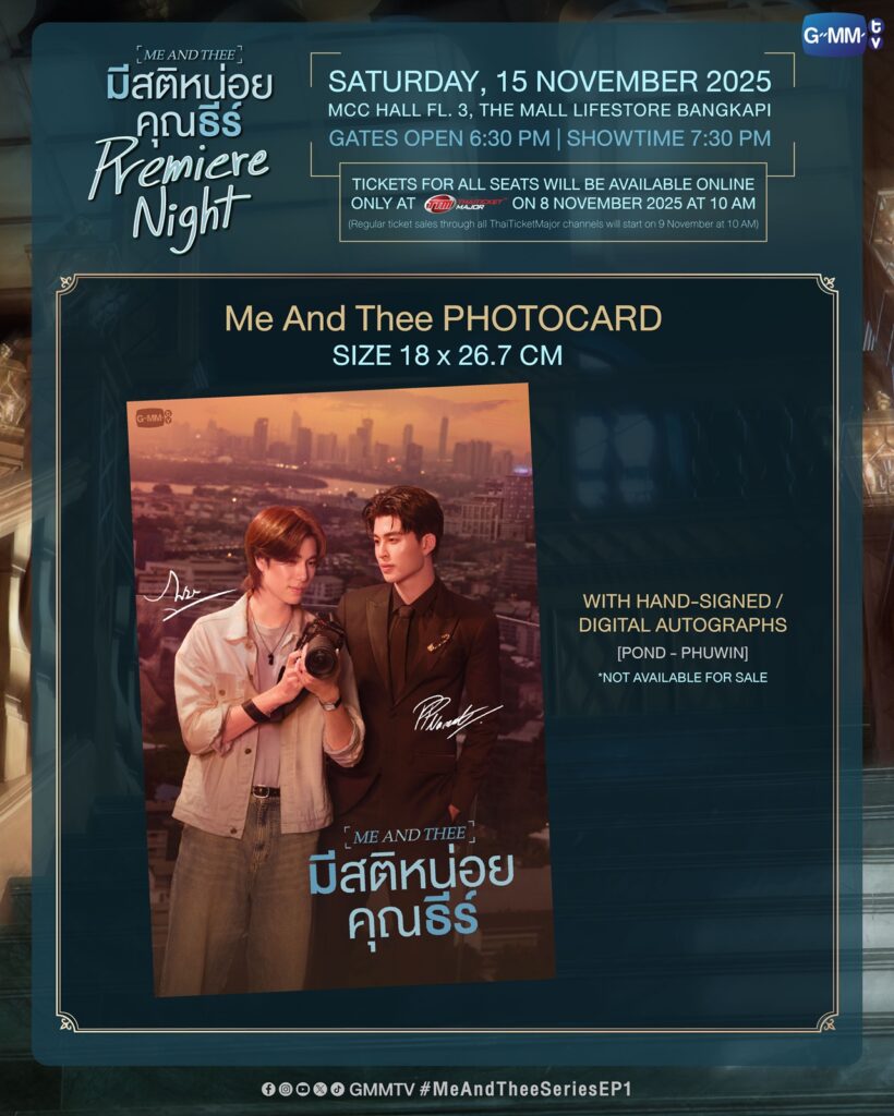 สองนักแสดงหนุ่มสุดฮอตอย่าง ปอนด์ ณราวิชญ์ เลิศรัตน์โกสุมภ์ และ ภูวินทร์ ตั้งศักดิ์ยืน เตรียมเดินหน้าเสิร์ฟความสุขให้กับแฟน ๆ ต่อเนื่อง ด้วยการจัดงาน มีสติหน่อยคุณธีร์ Me and Thee Premiere Night เพื่อร่วมชมตอนแรกของซีรีส์ที่กำลังเป็นที่จับตาอย่าง มีสติหน่อยคุณธีร์ Me and Thee จากผู้ผลิตคอนเทนต์ชั้นนำอย่าง GMMTV โดยงานนี้จะมีการแสดงสุดพิเศษจากนักแสดงนำ การพูดคุยกับผู้กำกับ รวมถึงการฉายตอนแรกให้ได้รับชมพร้อมกัน ในวันเสาร์ที่ 15 พฤศจิกายน 2568 ณ MCC HALL ชั้น 3 เดอะมอลล์ไลฟ์สโตร์ บางกะปิ