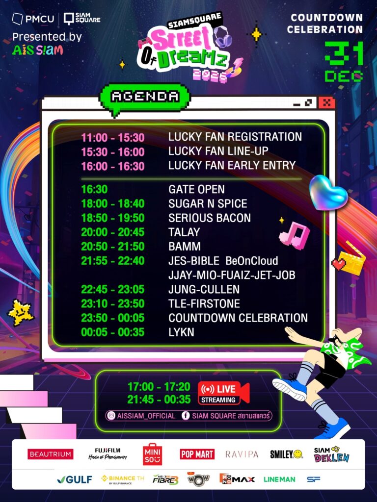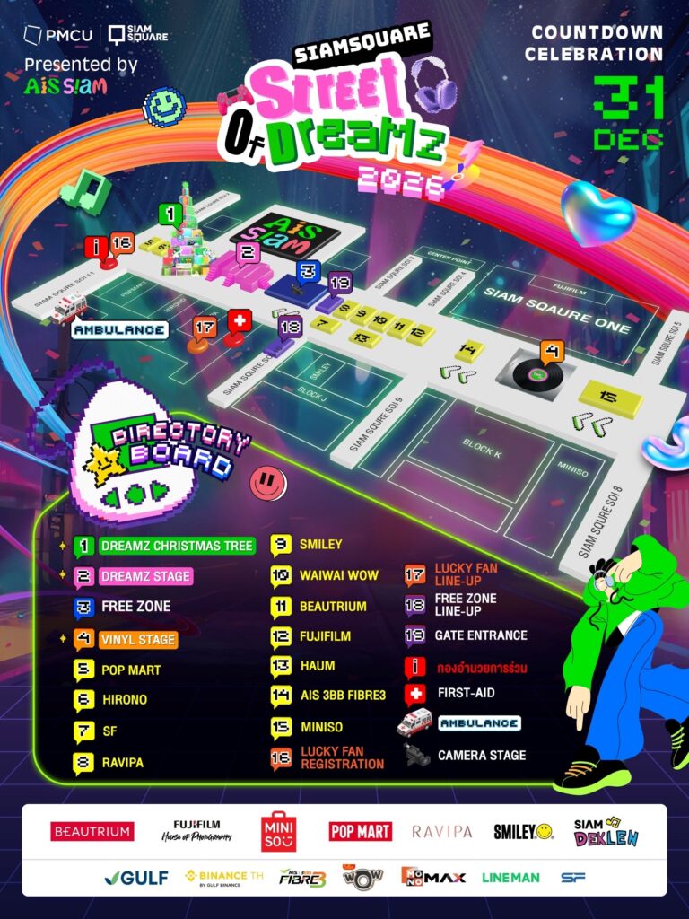 สำนักข่าวบริคอินโฟ – เอไอเอส สยาม (AIS SIAM) ร่วมกับ สำนักงานจัดการทรัพย์สิน จุฬาลงกรณ์มหาวิทยาลัย (PMCU) ประกาศความพร้อมจัดงานเฉลิมฉลองส่งท้ายปีเก่าต้อนรับปีใหม่ในงาน SIAM SQUARE STREET OF DREAMZ 2026 ณ บริเวณหน้า เอไอเอส สยาม (AIS SIAM) ย่านสยามสแควร์ ในวันที่ 31 ธันวาคม 2568 นี้ โดยเนรมิตพื้นที่ใจกลางกรุงเทพฯ ให้เป็นถนนแห่งความฝัน พร้อมเปิดโอกาสให้กลุ่มคนรุ่นใหม่หรือ Gen C ได้ออกมาร่วมกิจกรรมและชมคอนเสิร์ตจากศิลปินชื่อดังแบบเต็มอิ่มตลอดทั้งคืนจนถึงช่วงข้ามปี