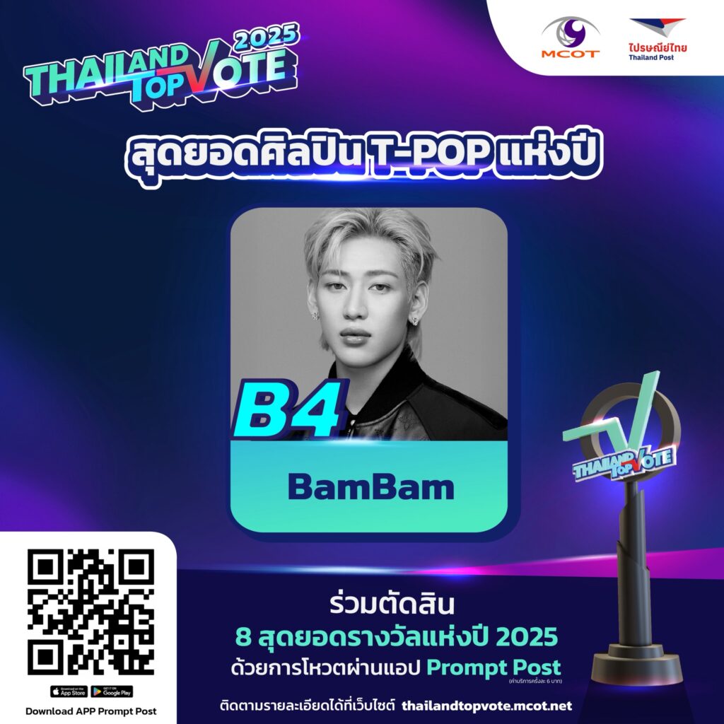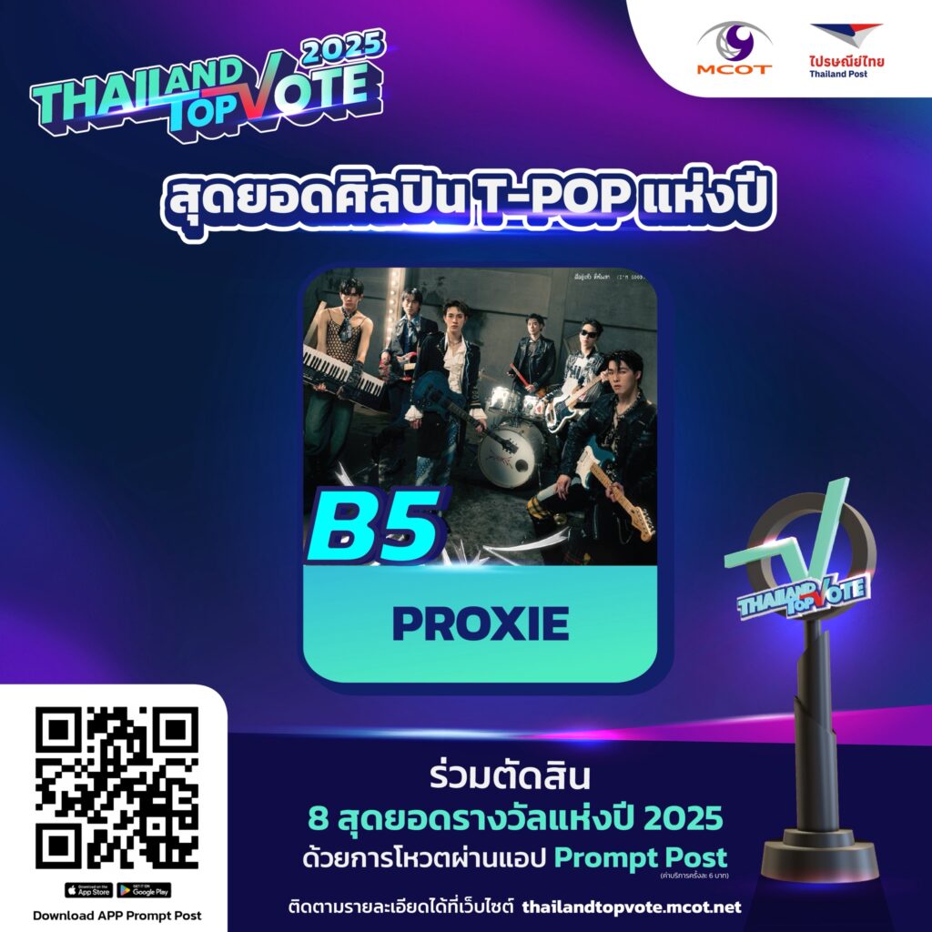 บริษัท อสมท จำกัด (มหาชน) ร่วมมือกับ บริษัท ไปรษณีย์ไทย จำกัด เดินหน้าจัดกิจกรรมประกาศรางวัลครั้งใหญ่ Thailand Top Vote 2025 ภายใต้แนวคิด VOICES OF WORTH เสียงแห่งคุณค่า เพื่อมอบรางวัลแห่งความภาคภูมิใจให้กับบุคคลและองค์กรในหลากหลายวงการ โดยไฮไลต์สำคัญในปีนี้อยู่ที่การเปิดโหวตเฟ้นหา สุดยอดศิลปิน T-POP แห่งปี ซึ่งได้รวบรวมรายชื่อ 5 ศิลปินและกลุ่มศิลปินยอดนิยมที่ผ่านเข้าสู่รอบสุดท้าย มาให้ประชาชนร่วมตัดสินผ่านคะแนนโหวต