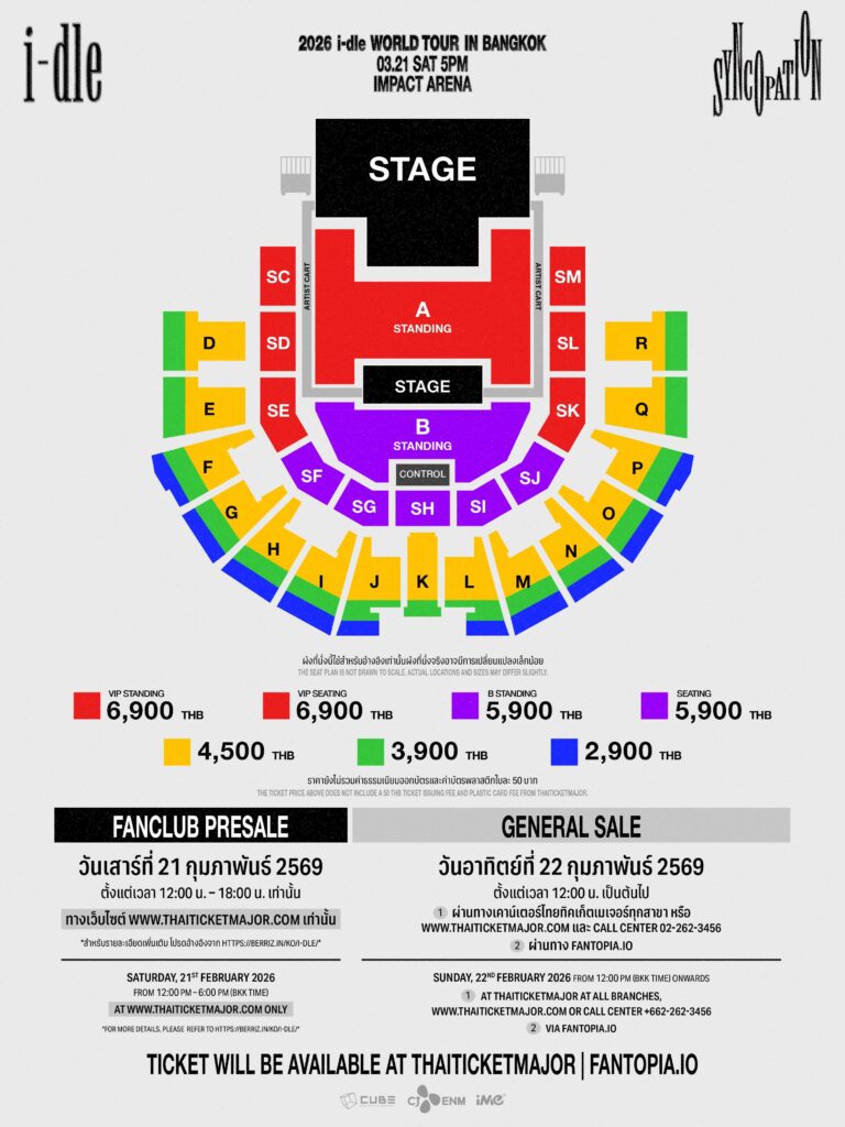 ในส่วนของการจำหน่ายบัตรคอนเสิร์ต 2026 i-dle WORLD TOUR [Syncopation] IN BANGKOK จะแบ่งออกเป็น 2 รอบหลัก โดยรอบ FANCLUB PRESALE จะเปิดให้จองในวันเสาร์ที่ 21 กุมภาพันธ์ 2569 เวลา 12.00 – 18.00 น. ผ่านทางช่องทางออนไลน์ของ ไทยทิกเก็ตเมเจอร์ (ThaiTicketMajor) เท่านั้น สำหรับรอบทั่วไปจะเริ่มจำหน่ายในวันอาทิตย์ที่ 22 กุมภาพันธ์ 2569 ตั้งแต่เวลา 12.00 น. เป็นต้นไป ผ่านทั้งช่องทางออนไลน์ เคาน์เตอร์ทุกสาขา และคอลเซ็นเตอร์ รวมถึงช่องทาง แฟนโทเปีย (Fantopia) ที่จะดูแลการจำหน่ายในโซนเฉพาะตามที่กำหนดไว้