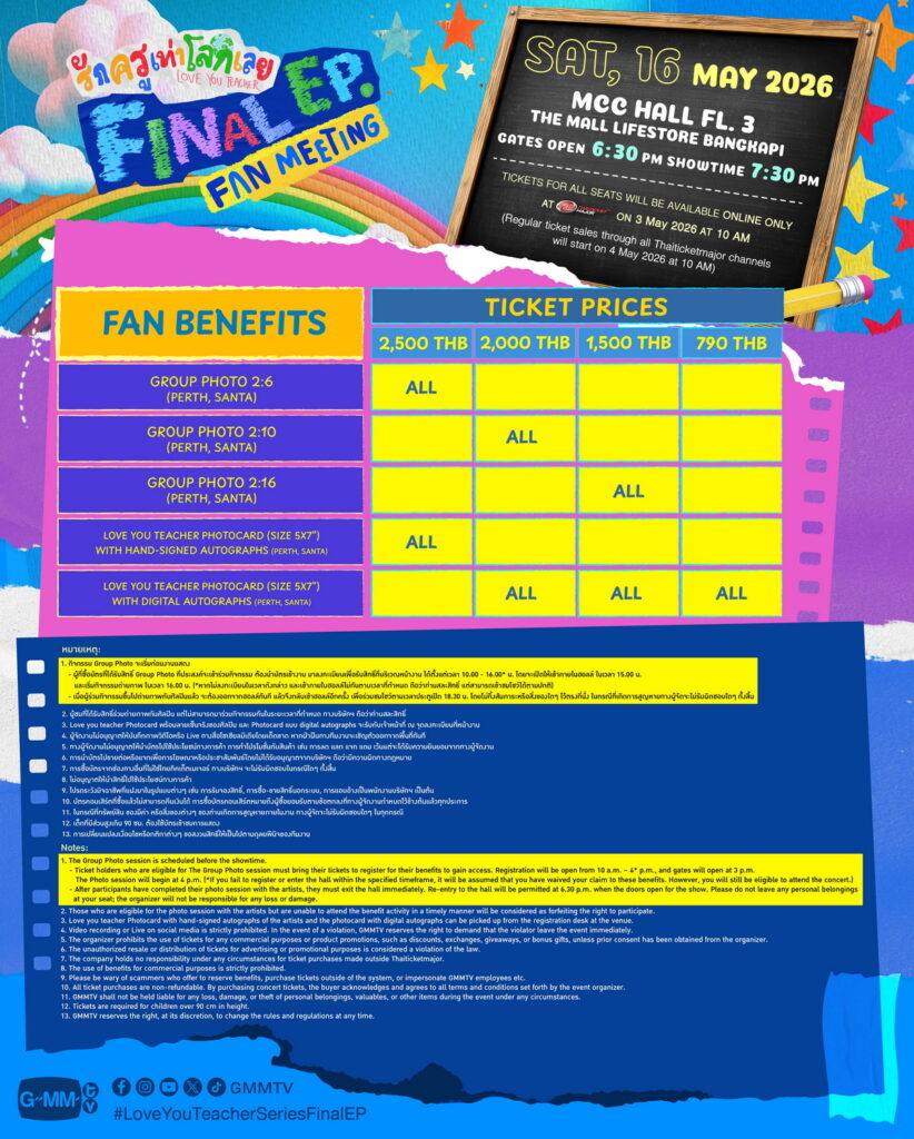รักครูเท่าโลกเลย Final EP. FAN MEETING ชวนแฟนคลับร่วมรับชมตอนจบของซีรีส์ รักครูเท่าโลกเลย LOVE YOU TEACHER พร้อมกับเหล่านักแสดงนำ นำโดย เพิร์ธ ธนพนธ์ สุขุมพันธนาสาร และ แซนต้า พงศภัค อุดมโภชน์ ในวันเสาร์ที่ 16 พฤษภาคม 2569 ณ เดอะมอลล์ไลฟ์สโตร์ บางกะปิ เพื่อสร้างความประทับใจส่งท้ายบทเรียนรักที่ได้รับความนิยมอย่างต่อเนื่องบนโลกโซเชียล