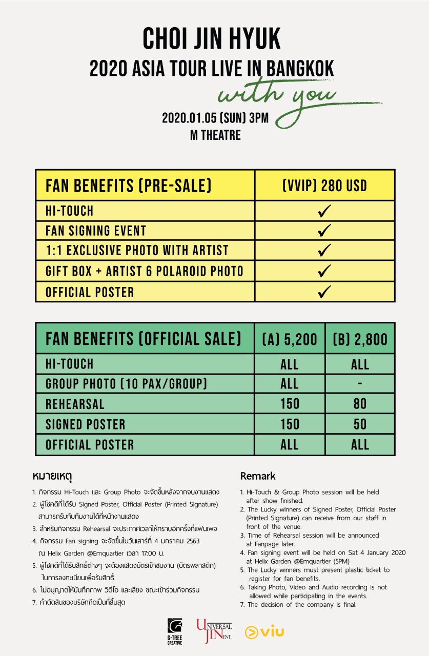 และจะเปิดจำหน่ายบัตรอย่างเป็นทางการในประเทศไทย วันเสาร์ที่ 30 พฤศจิกายน 2562 เวลา 12:00 น. ผ่านนาง https://www.choijinhyukasiatourinbkk.com