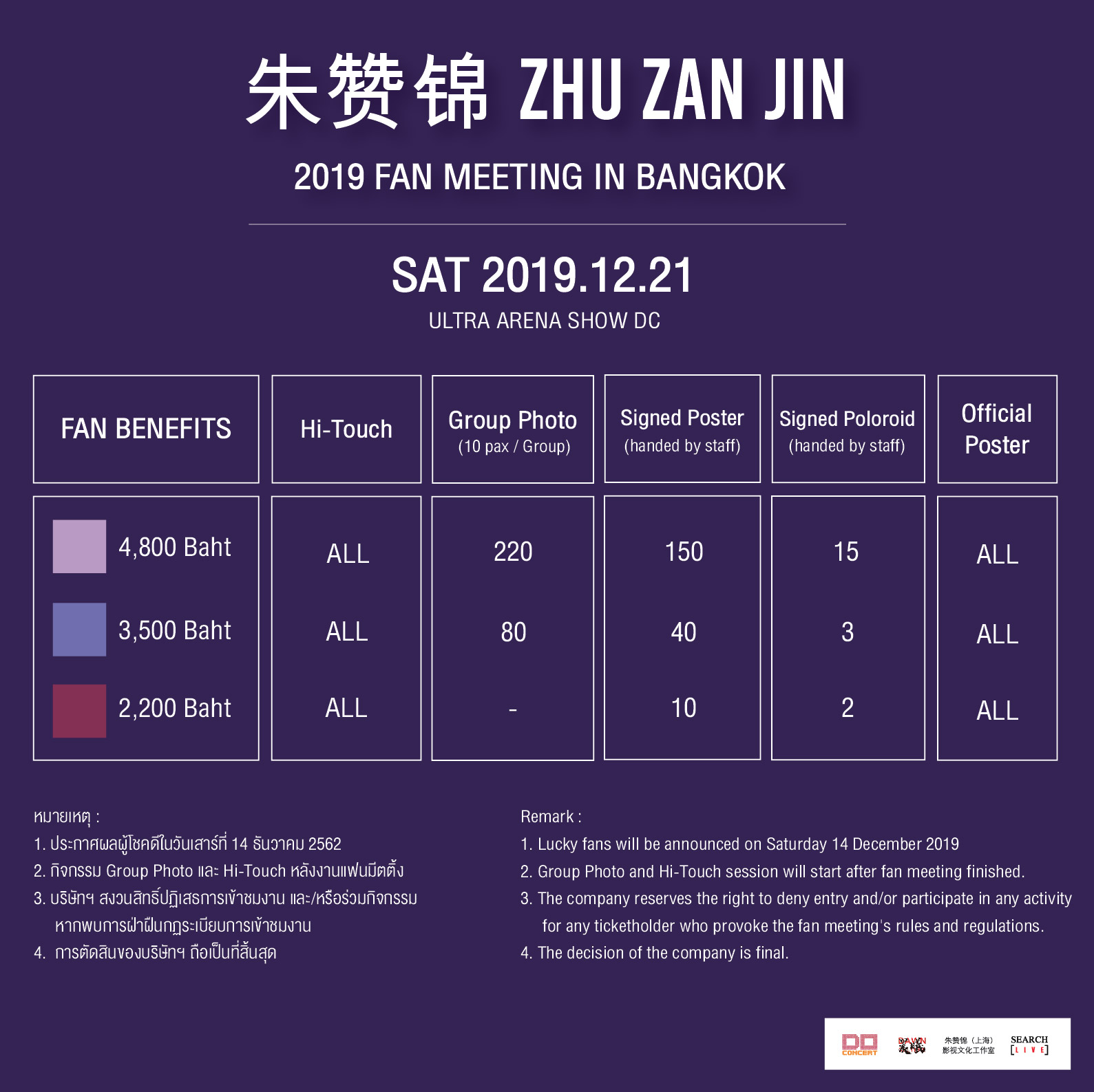 บริษัท ดูคอนเสิร์ต จำกัด ขอมอบของขวัญส่งท้ายปีให้กับแฟน ๆ ชาวไทย ได้มีช่วงเวลาสุดพิเศษกับ จูจ้านจิ่น (Zhu Zan Jin) ในงานแฟนมีตติ้ง “Zhu Zan Jin 2019 Fan Meeting in Bangkok” วันเสาร์ที่ 21 ธันวาคม 2562 ที่อัลตร้า อารีน่า ฮอลล์ โชว์ ดีซี โดยทุกที่นั่งจะได้รับสิทธิ์ไฮทัช (Hi-Touch) กับศิลปินที่น่ารักอย่างใกล้ชิด เพิ่มเติมจากสิทธิพิเศษอื่น ๆ ของบัตรในแต่ละราคา เปิดจำหน่ายบัตรพร้อมกันทาง www.doconcert-ticket.com วันเสาร์ที่ 30 พฤศจิกายน 2562 เวลา 10:00 น. (สำหรับคนไทย) และ 12:00 น. (สำหรับต่างชาติ) สามารถติดตามทุกความเคลื่อนไหวได้ที่ www.facebook.com/doconcert ทวิตเตอร์ @doconcert