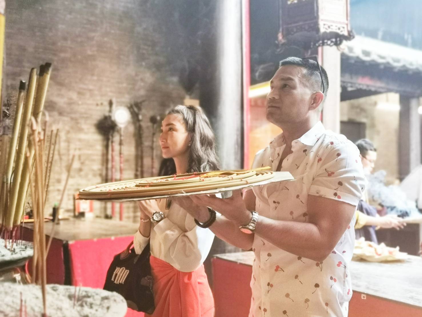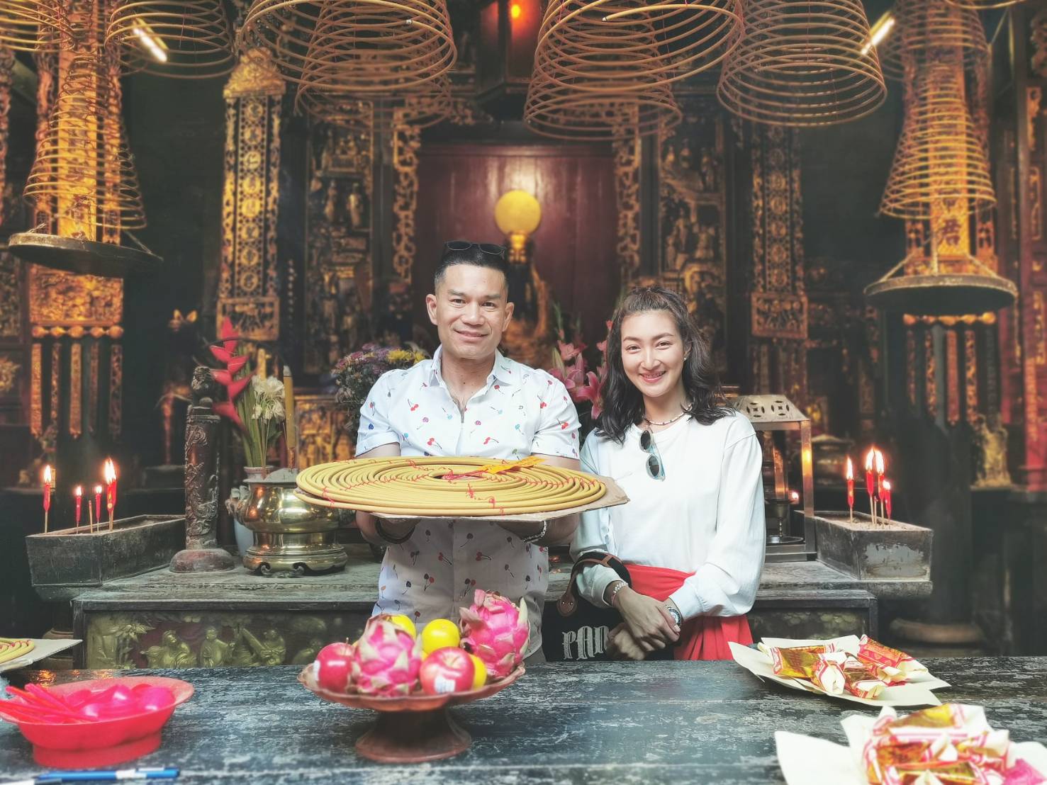 หลังจากที่ลงวิ่ง มาเก๊ามาราธอน เสร็จเรียบร้อย ทั้งคู่ยังได้ควงคู่กันไปทำบุญเสริมดวงต่อทันที โดยได้ไปไหว้พระขอพรวัดดังของมาเก๊า เริ่มกันที่ “วัดกวนอู”ซึ่งเล่าขานว่าวัดนี้ศักดิ์สิทธ์ในเรื่องของการขอพรเกี่ยวกับเรื่องงาน ใครมาขอพรที่นี่ มักจะสมหวังทุกราย โดยเฉพาะการมาขอให้ได้เลื่อนขั้น เลื่อนตำแหน่ง ทำเอาสารวัตรหมี ตั้งใจไหว้ขอพรสุดๆ จากนั้นทั้งคู่ก็ได้ไปไหว้ขอพรกันต่อที่ “วัดอาม่า” เป็นวัดที่สำคัญคู่บ้านคู่เมืองของมาเก๊า สำหรับใครที่อยากขอพรเรื่องการเงิน การค้าขาย ให้เงินทองไหลมาเทมา ต้องไม่พลาดมาไหว้ขอพรที่วัดนี้ให้ได้ งานนี้ทั้งคู่ อิ่มบุญ สุขใจกันถ้วนหน้า