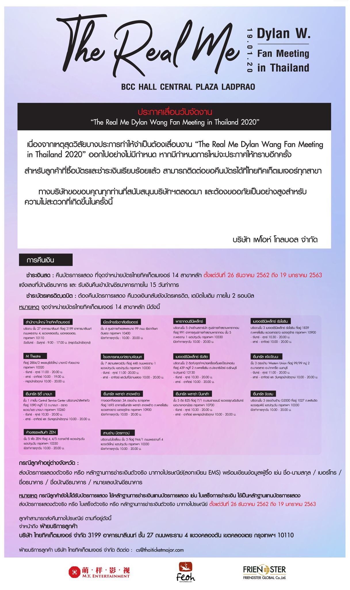บริษัท เฟโอห์ โกลบอล จำกัด ผู้จัดงาน “The Real Me Dylan Wang Fan Meeting in Thailand2020” ระบุว่า เนื่องจากเหตุสุดวิสัยบางประการทำให้จำเป็นต้องเลื่อนงาน ออกไปอย่างไม่มีกำหนด หากมีกำหนดการใหม่จะประกาศให้ทราบอีกครั้ง สำหรับลูกค้าที่ซื้อบัตรและชำระเงินเรียบร้อยแล้ว สามารถติดต่อขอคืนบัตรได้ที่ไทยทิคเก็ตเมเจอร์ทุกสาขา ทางบริษัทขอขอบคุณทุกท่านที่สนับสนุนบริษัทฯตลอดมา และต้องขออภัยเป็นอย่างสูงสำหรับความไม่สะดวกที่เกิดขึ้นในครั้งนี้