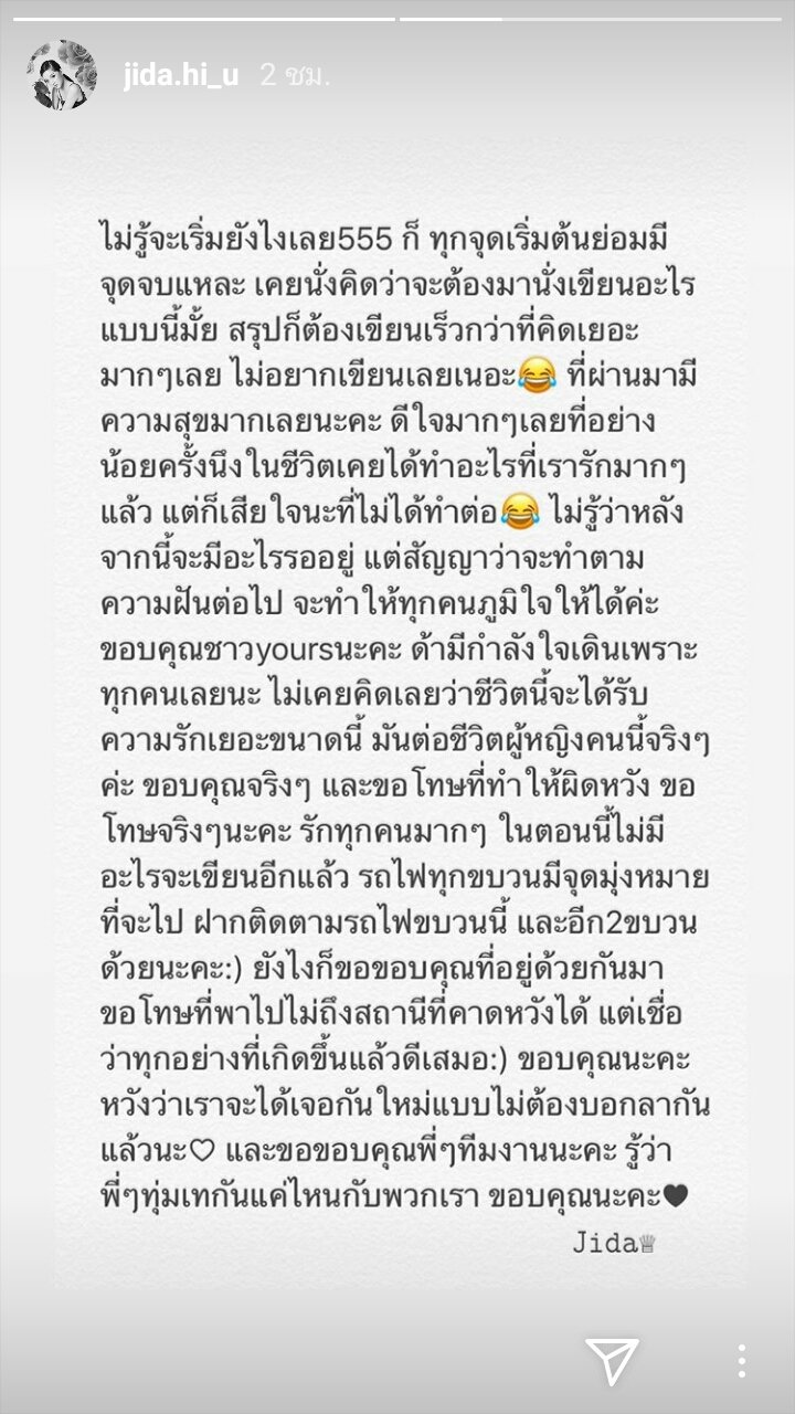 โดยด้านสาว ““จิด้า” จิดาภา ศิริบัญชาวรรณ” 1 ในสมาชิกวง ก็ได้อัพ Intragram ขอโทษและขอบคุณแฟนๆที่ติดตามสนับสนุนมาตลอด