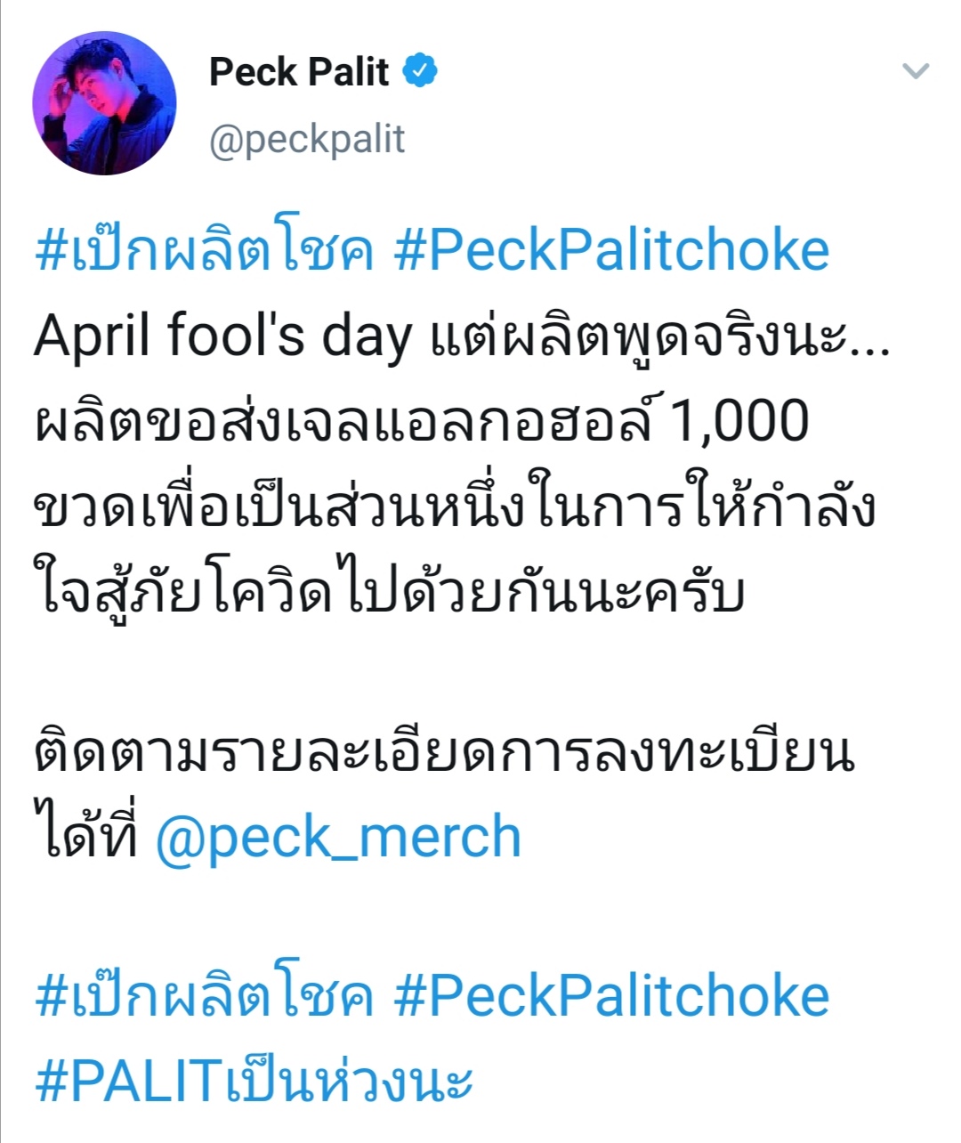 “เป๊ก – ผลิตโชค อายนบุตร” ซูเปอร์สตาร์ขวัญใจแฟนๆ แห่งจีเอ็มเอ็ม แกรมมี่ฯ ขึ้นชื่อเรื่องใจดีใจบุญอยู่แล้ว ยิ่งบ้านเราอยู่ในภาวะวิกฤตแบบนี้ ไม่ยอมอยู่เฉย ล่าสุดประกาศแจกเจลล้างมือแอลกอฮอล์จำนวน 1,000 ชิ้น เพื่อขอเป็นส่วนหนึ่งในการให้กำลังใจผู้ประสบภัยจาก COVID-19 โดยเจ้าตัวกล่าวว่า “ผมเป็นห่วงทุกคนครับ มันอาจจะไม่ได้มีจำนวนมากมายอะไรนัก แต่ตั้งใจทำมาฝากให้ทุกคนได้ใช้ พกพาง่าย หวังว่าจะเป็นหนึ่งกำลังใจเล็กๆ ให้ทุกคนผ่านพ้นช่วงนี้ไปได้ ขอให้ทุกคนแข็งแรงปลอดภัยนะครับ”