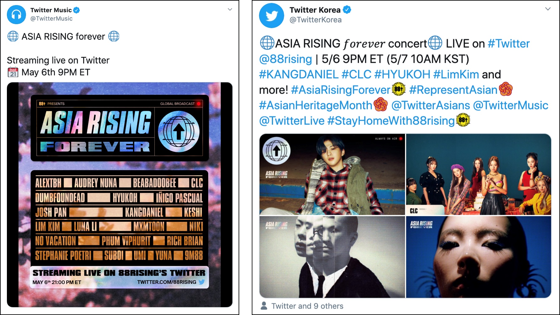 ระหว่างงาน Asia Rising Forever ผู้ใช้ Twitter จะได้เพลิดเพลินกับการแสดงจากศิลปินทั้งจากในและต่างประเทศกว่า 20 กลุ่มที่กำลังได้รับความนิยมอย่างรวดเร็วในสหรัฐอเมริกา สำหรับตัวแทนจากเกาหลี KANGDANIEL (@konnect_danielk), CLC (@CUBECLC), Hyukoh (@hyukohh) และ Lim Kim (Yerim Kim) จะร่วมทำการแสดง นอกจากศิลปินจากเกาหลีแล้ว ศิลปินชาวเอเชียอย่าง NIKI (@nikizefanya), Keshi (@keshimusic) และ Rich Brian (@richbrian) จะร่วมแสดงด้วย ศิลปินที่เข้าร่วมครั้งนี้จะทำการโชว์ในรูปแบบที่ต่างกันออกไป ไม่ว่าจะเป็นการให้สัมภาษณ์แบบเอ็กซ์คลูซีฟ การเล่นเกมเซอร์ไพรส์ และการแสดงสุดส่วนตัวจากห้องนอนของพวกเขาเองผ่านการสตรีมมิงในคอนเสิร์ต Asia Rising Forever และแฟน ๆ ยังสามารถติดตามคลิปไฮไลต์ผ่านทาง Twitter หลังการถ่ายทอดสดสิ้นสุดแล้ว รวมถึงช่วงถาม-ตอบสุดพิเศษกับวง CLC (@CUBECLC)ได้อีกด้วย