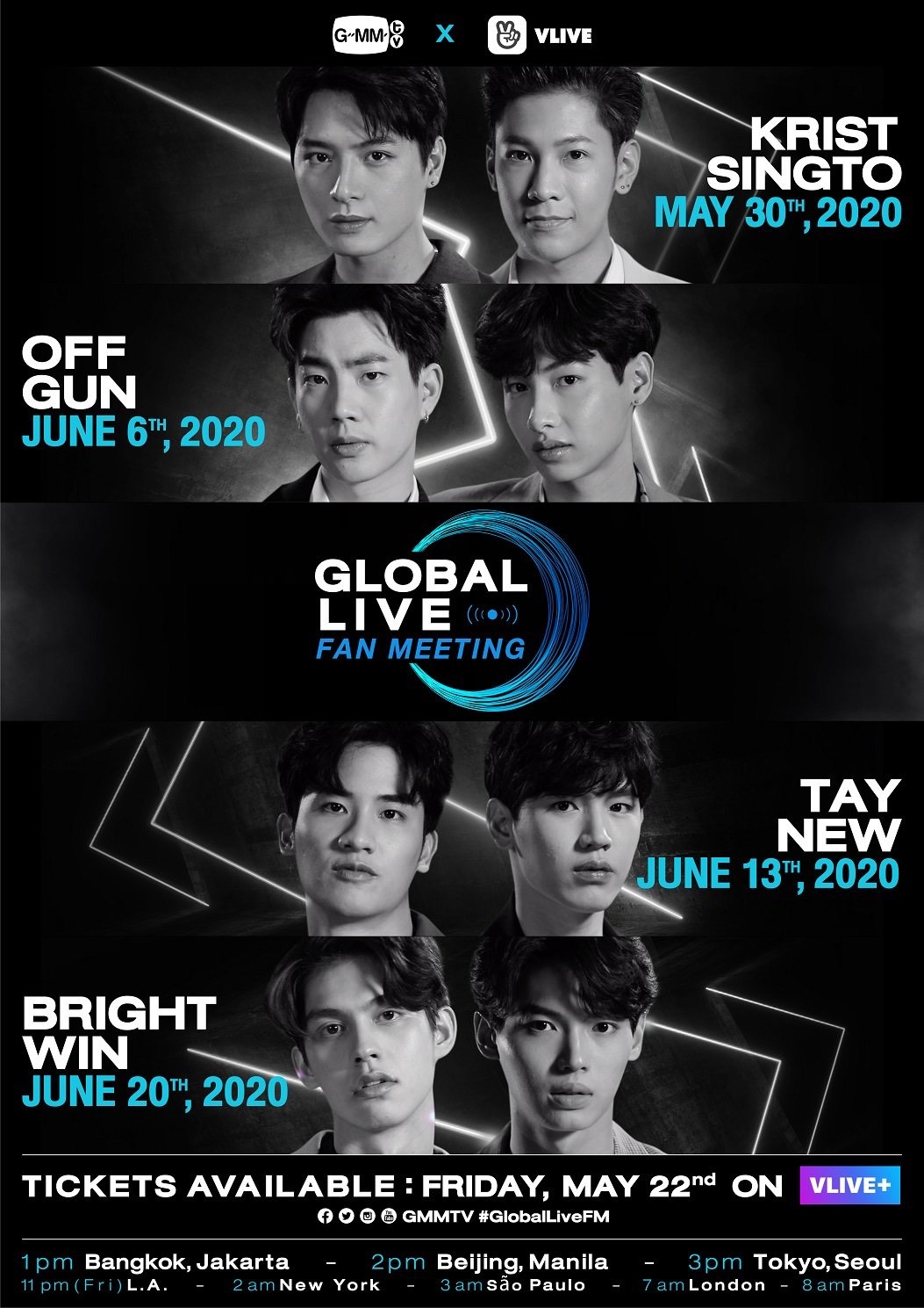 เริ่มวันที่ 30 พฤษภาคม กับ “คริส-สิงโต” / 6 มิถุนายน กับ “ออฟ-กัน” / 13 มิถุนายน กับ “เต-นิว” และปิดท้าย 20 มิถุนายน กับ “ไบร์ท-วิน” เวลา 13.00 น. (ตามเวลาในประเทศไทย) ทาง แอปพลิเคชัน VLIVE+ ซึ่งงานนี้ถือเป็นการฝ่าวิกฤตด้วยการสร้างสรรค์ความบันเทิงผสานกับการนำเสนอด้วยเทคโนโลยีที่ทันสมัยรูปแบบใหม่ที่จะทำให้ทุกคนได้เต็มอิ่มไปกับการชมโชว์สุดเอ็กซ์คลูซีฟ ทั้งร้องทั้งเต้น พูดคุยอย่างเป็นกันเอง ในกิจกรรมถามตอบ พร้อมการเล่นเกมแบบ Interactive เสมือนจริง เพื่อลุ้นรับรางวัลพิเศษอีกด้วย