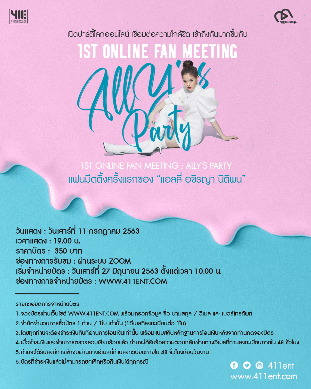 “สวัสดีค่ะ แอลลี่จาก 411 Music นะคะ เร็วๆ นี้จะมีงานที่อยากเชิญทุกคนให้มาสนุกด้วยกัน ซึ่งก็คืองาน 1st Online Fan Meeting : ALLY’s PARTY นะคะ วันที่ 11 กรกฎาคมนี้ 1 ทุ่มตรงค่ะ แอลลี่ตื่นเต้นมาก ๆ เลยค่ะ เพราะว่างานนี้เป็นงานแรกที่จะได้เจอกับทุก ๆ คน และเราก็จะได้มาร้องเพลง มาเต้น มาปาร์ตี้ด้วยกันให้ทุกคนหายคิดถึงนะคะ ในวันนั้นก็จะมีกิจกรรมให้ทุกคนได้ร่วมสนุก และก็มีเซอร์ไพรส์ที่…. ยังไม่บอกดีกว่าค่ะ! ให้ทุกคนไปดูกันในวันงานนะคะ เจอกันค่า”