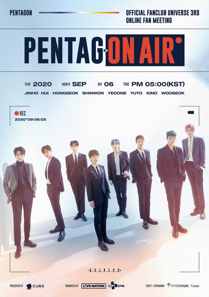 Pentagon พร้อมแล้วที่จะพบกับแฟนๆ ทั่วโลกผ่านงานแฟนมีตติ้งออนไลน์ในวันที่ 6 กันยายนนี้ เวลา 15.00 น. (เวลาไทย) กับงาน ‘Official Fanclub UNIVERSE 3rd Online Fan Meeting [PENTAG-ON AIR]’ โดยในงานนี้หนุ่มๆ ได้เตรียมโชว์สุดพิเศษ และการแสดงที่ยอดเยี่ยม รวมทั้งเตรียมที่จะมอบความใกล้ชิดให้กับชาว UNIVERSE ทั่วโลกอีกด้วย ซื้อบัตรได้แล้วผ่านทาง Interpark Ticket