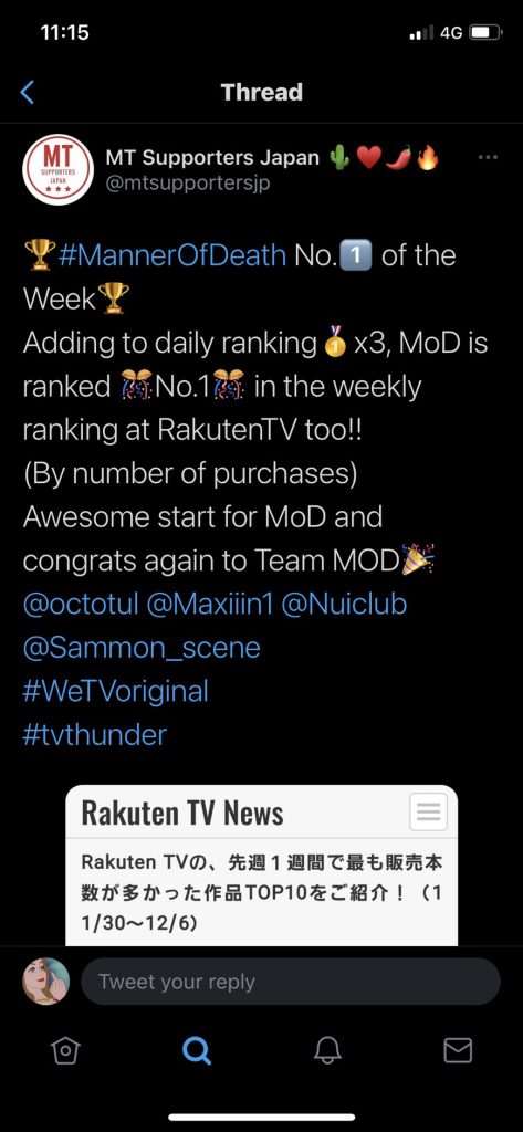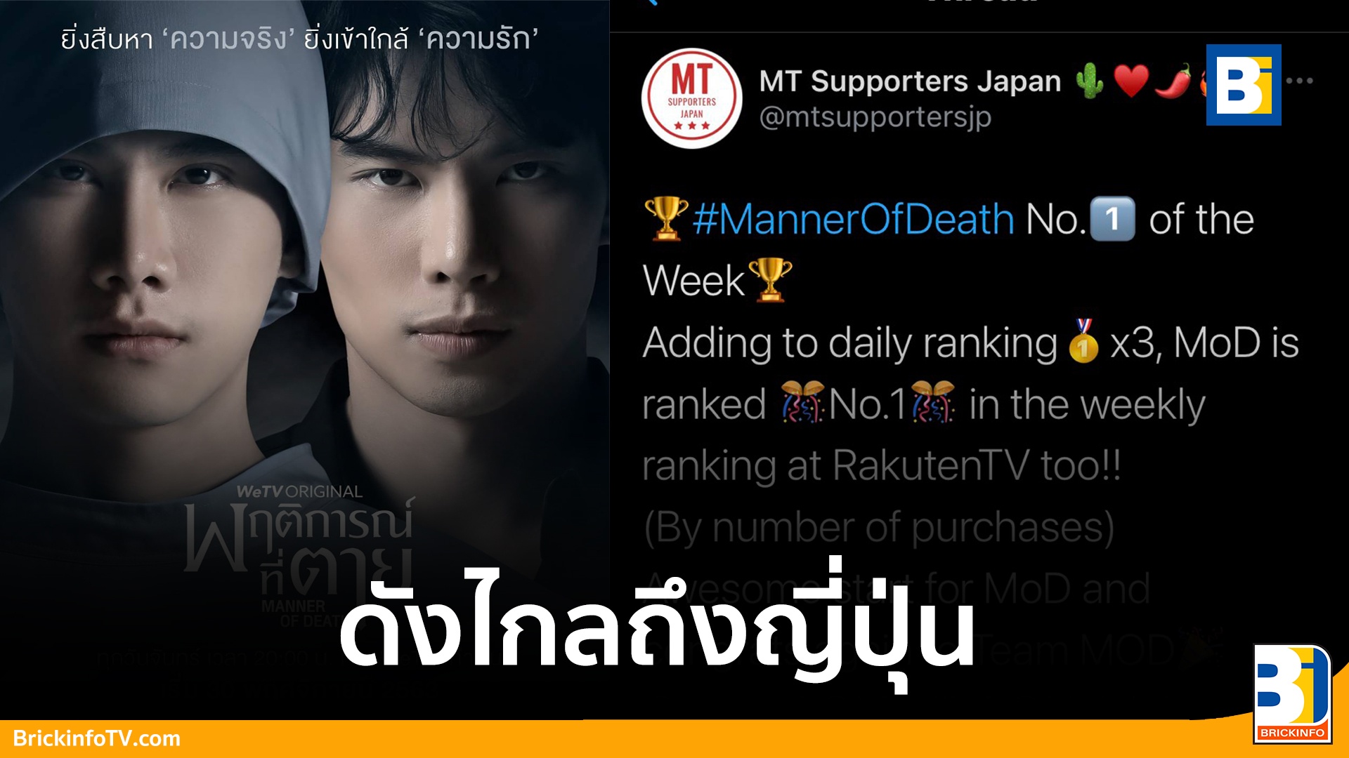 เรียกได้ว่ากระแสแรงแบบไม่มีตก สำหรับ “พฤติการณ์ที่ตาย Manner of Death” ซีรีส์วายแนวสืบสวนเรื่องแรกของไทย จากโปรเจกต์ WeTV ORIGINALS ที่ WeTV ควบคุมการผลิตร่วมกับ ทีวี ธันเดอร์ ล่าสุดเข้าตาสตรีมมิ่งยักษ์ใหญ่ของญี่ปุ่นอย่าง Rakuten TV ติดต่อนำซีรีส์ไปออกอากาศคู่ขนานกับช่วงเวลาที่ออนแอร์ในประเทศไทย แถมติด Top Rank ตั้งแต่ตอนแรกที่ออกอากาศ เรียกได้ว่าโกอินเตอร์ดังไกลถึงแดนปลาดิบประเทศญี่ปุ่นแบบงดงาม ถือเป็นอีกหนึ่งความสำเร็จของซีรีส์วายเมืองไทยในตลาดต่างประเทศ