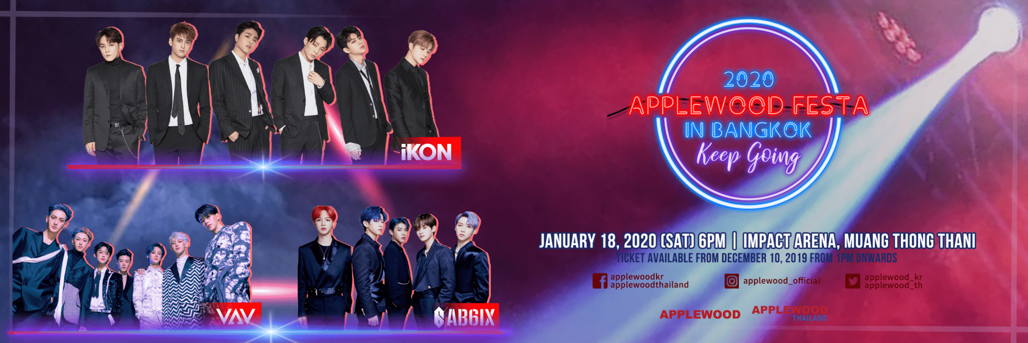 เปิดศักราชแบบปังๆ เมื่อบริษัท บริษัท แอ๊ปเปิ้ลวูด (APPLEWOOD CREATIVE) และ บริษัท แอ๊ปเปิ้ลวูด (ไทยแลนด์) (APPLEWOOD THAILAND) เอาใจแฟนๆชาวไทย ผนึกกำลัง 3 ค่ายเพลงเกาหลี ไม่ว่าจะเป็น วายจี เอ็นเตอร์เทรนเมนต์ (YG Entertainment ), แบรนด์นิว มิวสิค (Brand New Music) และ เอ ทีม เอ็นเตอร์เทรนเมนต์ (A Team Entertainment) เตรียมจัดคอนเสิร์ตสุดยิ่งใหญ่ต้อนรับปีใหม่กับงาน 2020 APPLEWOOD FESTA IN BANGKOK : KEEP GOING ที่จะได้พบกับเหล่าศิลปินจากทั้ง 3 ค่าย ได้แก่ iKON , AB6IX และ VAV ที่เตรียมพร้อมที่จะมาสร้างความทรงจำในคอนเสิร์ตครั้งนี้อย่างเต็มที่แบบเต็มอิ่มจุใจกว่า 3 ชั่วโมง และทำการแสดงวงละไม่ต่ำกว่า 9 เพลง ซึ่งงานคอนเสิร์ตครั้งนี้จะจัดขึ้นในวันเสาร์ที่ 18 มกราคม 2563 เวลาแสดง 18.00 น. ณ อิมแพค อารีน่า เมืองทองธานี